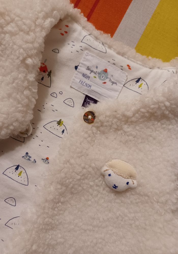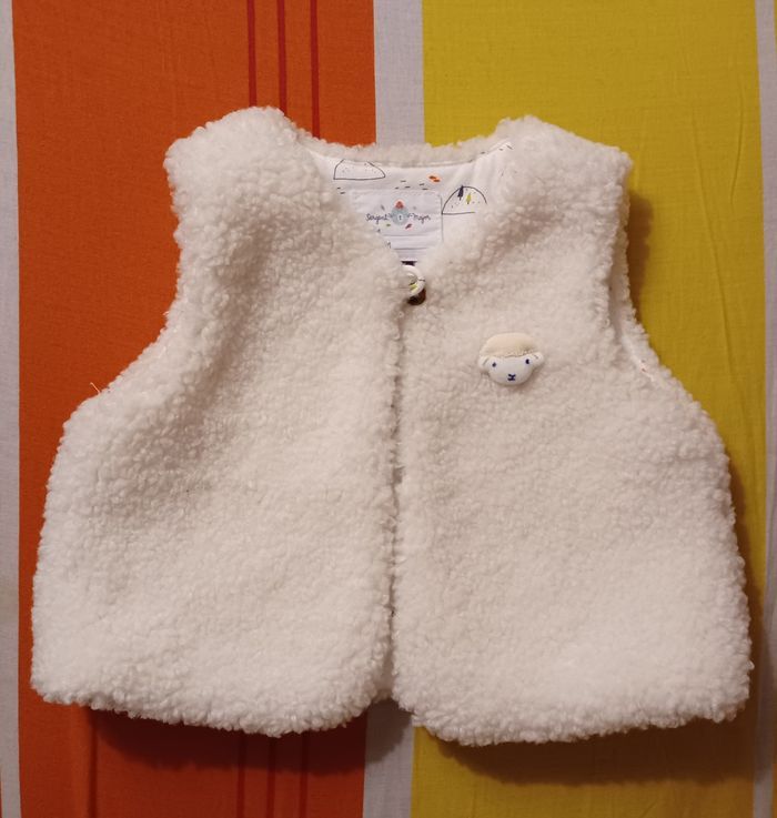 Gilet moumoute comme neuf Sergent Major payer 19,99€ en boutique 👶 Matière en fourrure blanc synthétique bouclée et doublure en jersey 👶 Doublure blanche imprimée 👶 Un bouton à l'avant 👶 patch animal à l'avant 👶 taille 3 mois ( 59 cm) (Tout les vêtements porté vendus , sont évidemment lavés).
