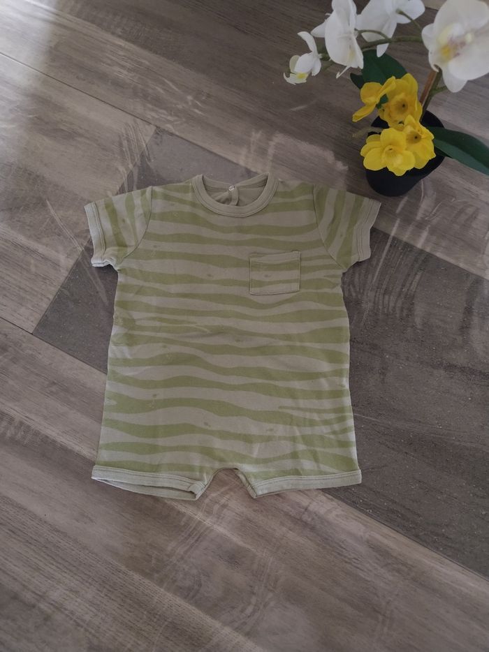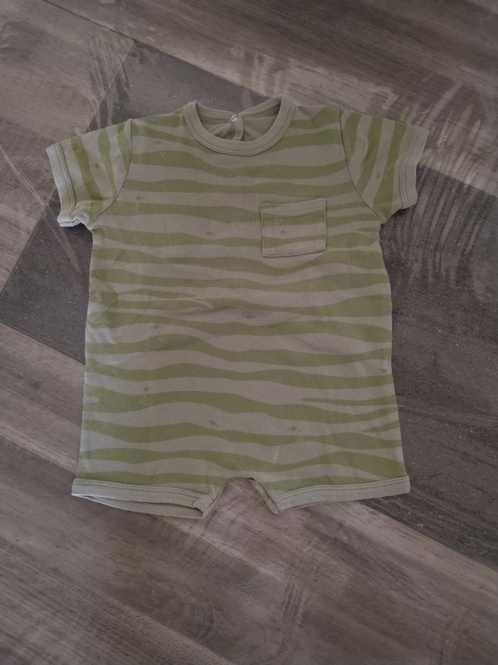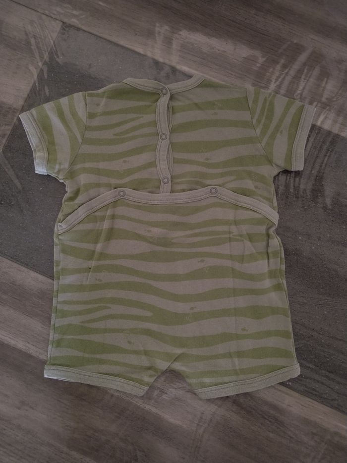 Pyjashort une pièce d'été à manches courtes Marque Petit Bateau Taille 12 mois, 74 cm • Coloris vert • Rayures • Poissons • Pressions au dos • Tissu fin • Coloris légèrement passé • Quelques bouloches En bon état #evelyne_garcons_12mois #evelyne_garcons