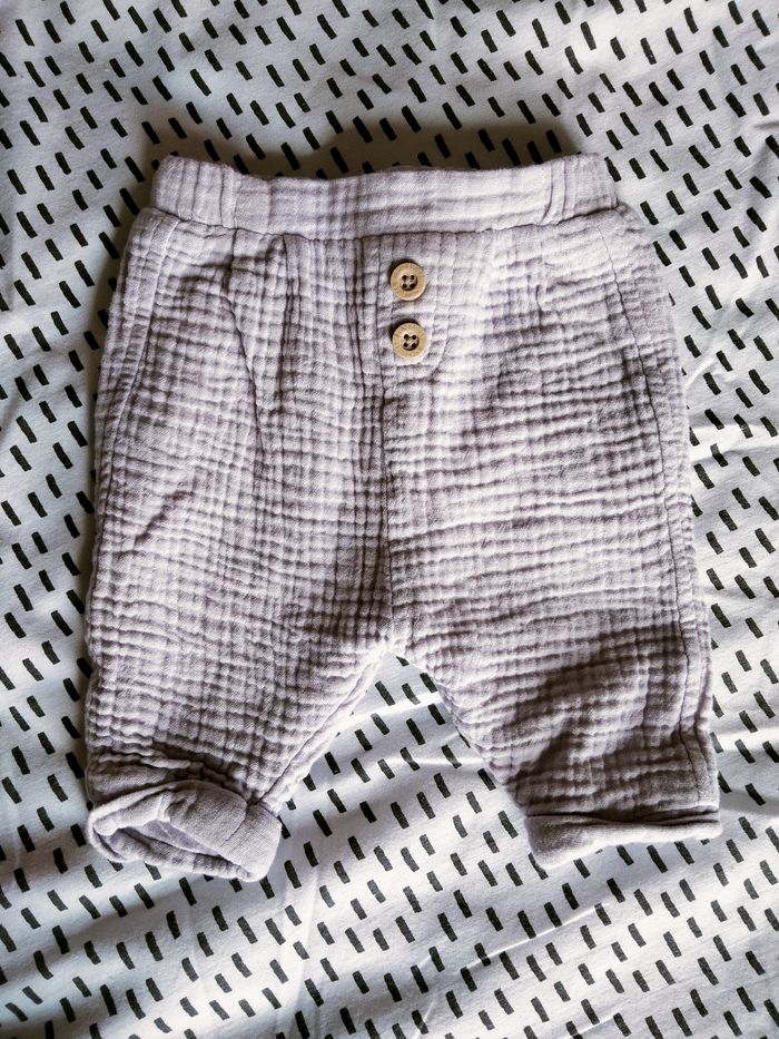 Matière gaze extérieur doublé coton intérieur Couleur violine (ça ressort mal sur la photo...) Taille élastique faux boutons Peu porté Assez large du fait de la coupe sarouel