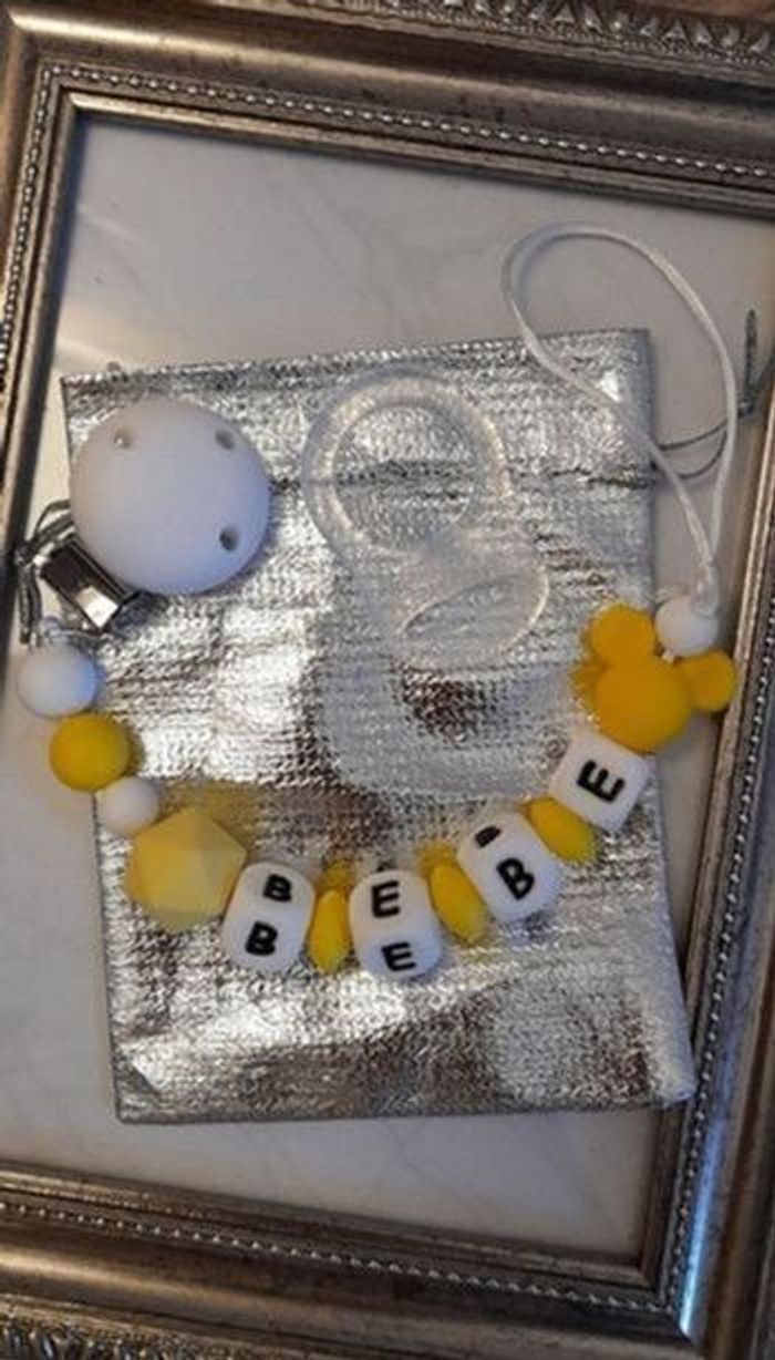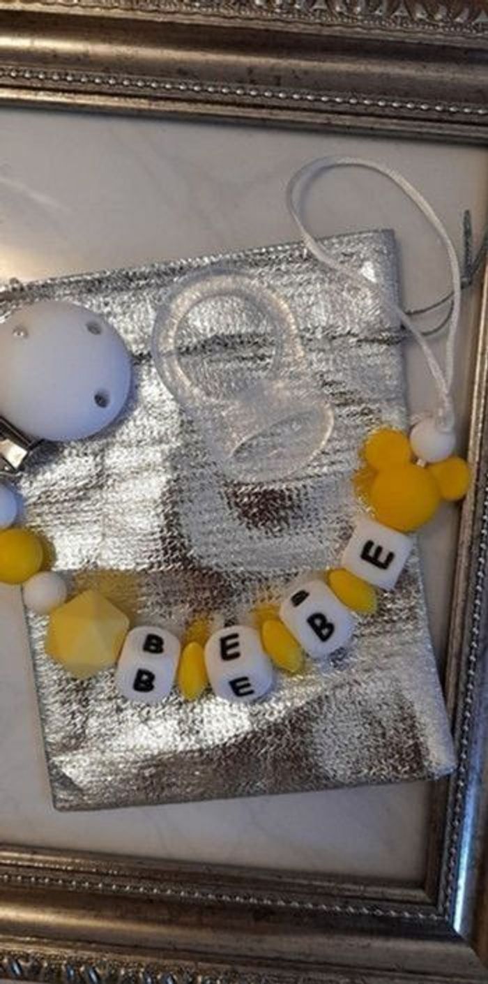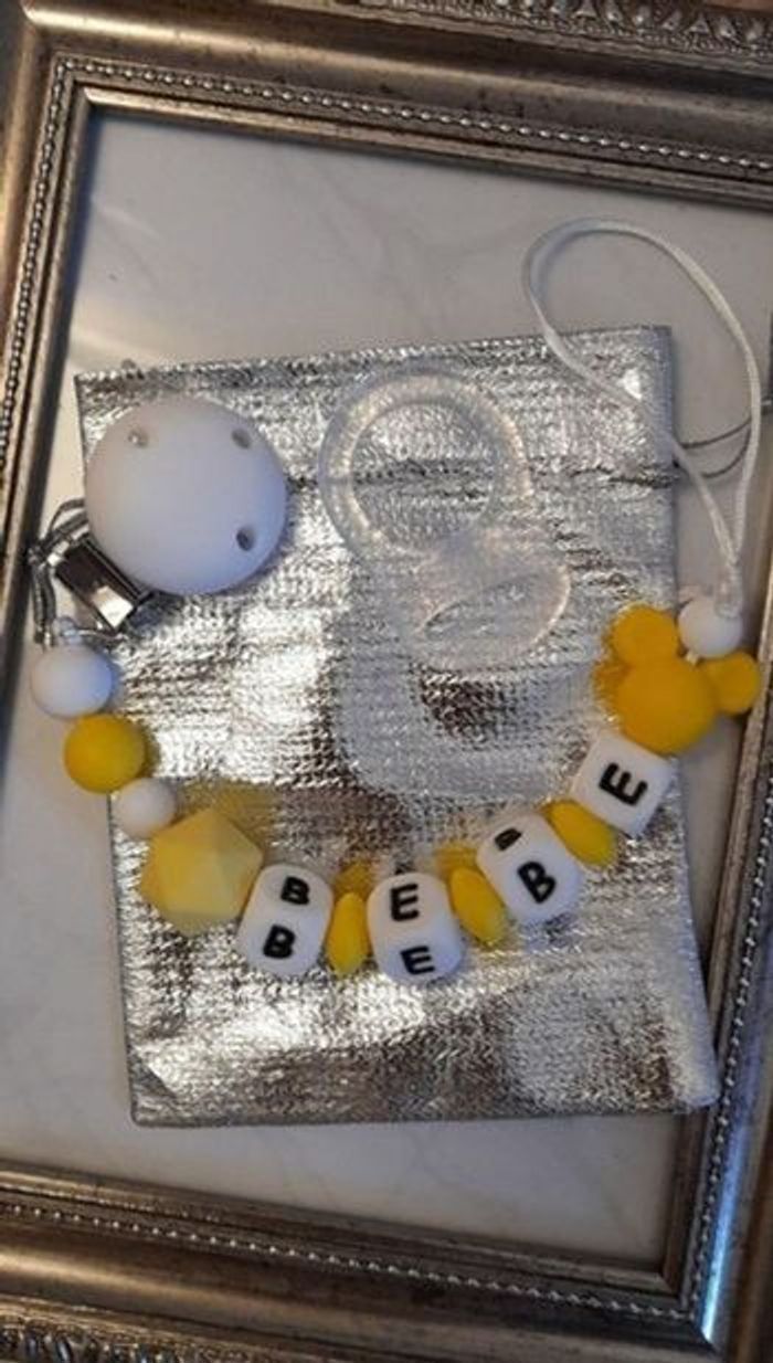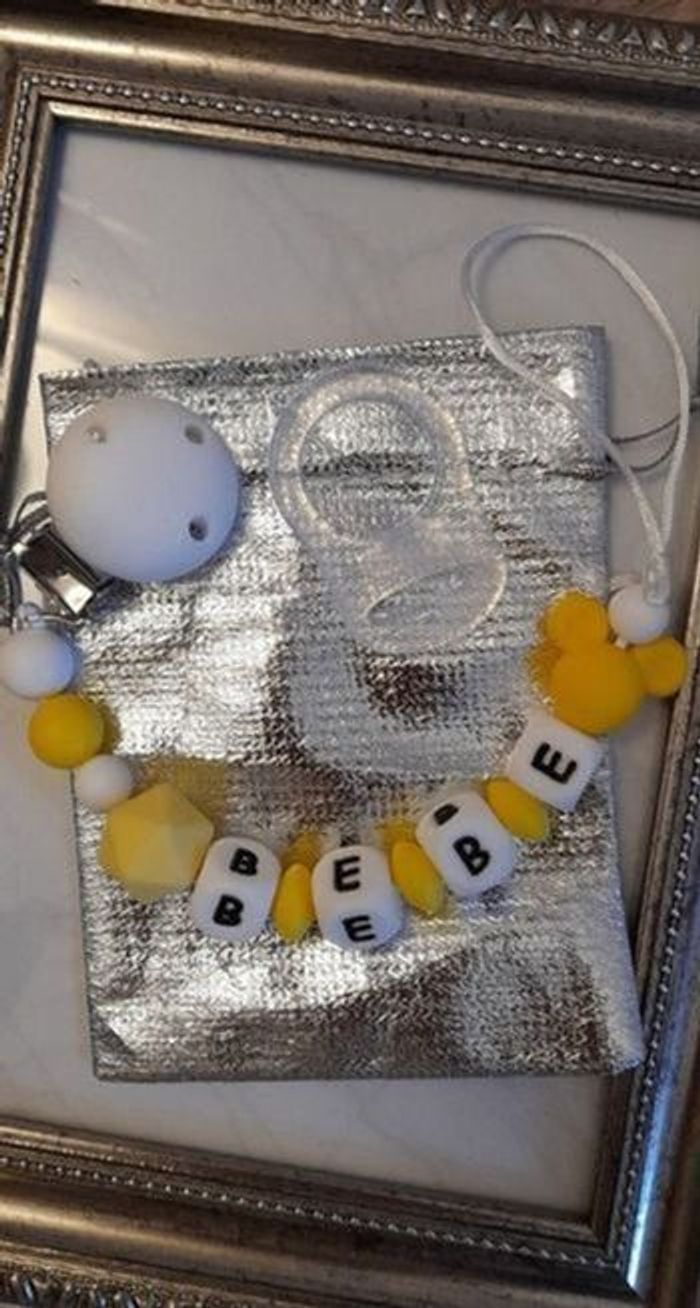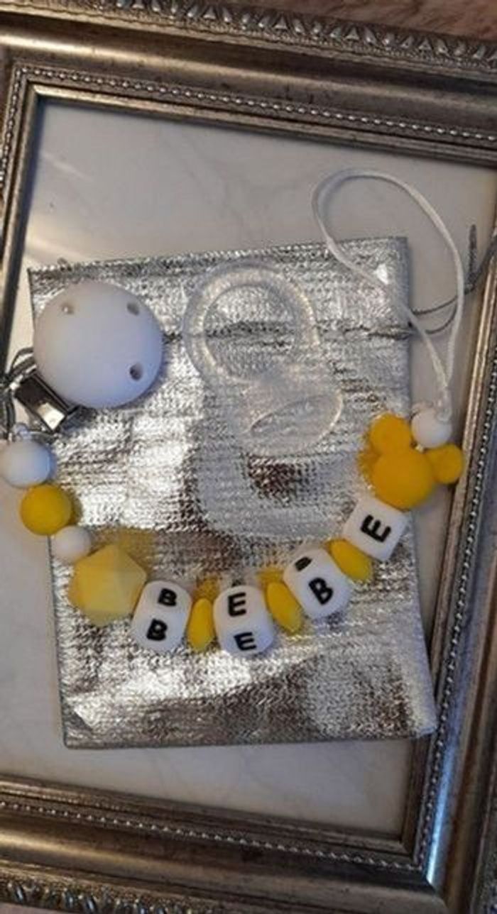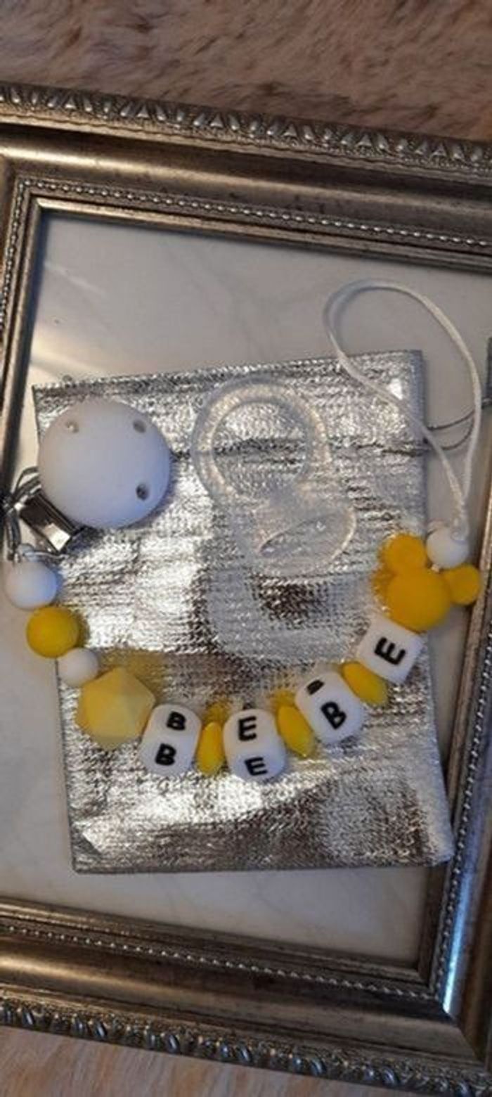 Attache tetine personnalisé avec le prénom de votre choix .offert avec une pochette cadeau et un adaptateur tétine. Réalisation et envoie sous 48h selon le stock le matériel utilisé pour la fabrication est aux normes européennes en respectant les normes de sécurité pour bébé. N'hésitez pas à m'envoyer un message pour plus d'informations et regardez mon compte il y a plusieurs modèles.