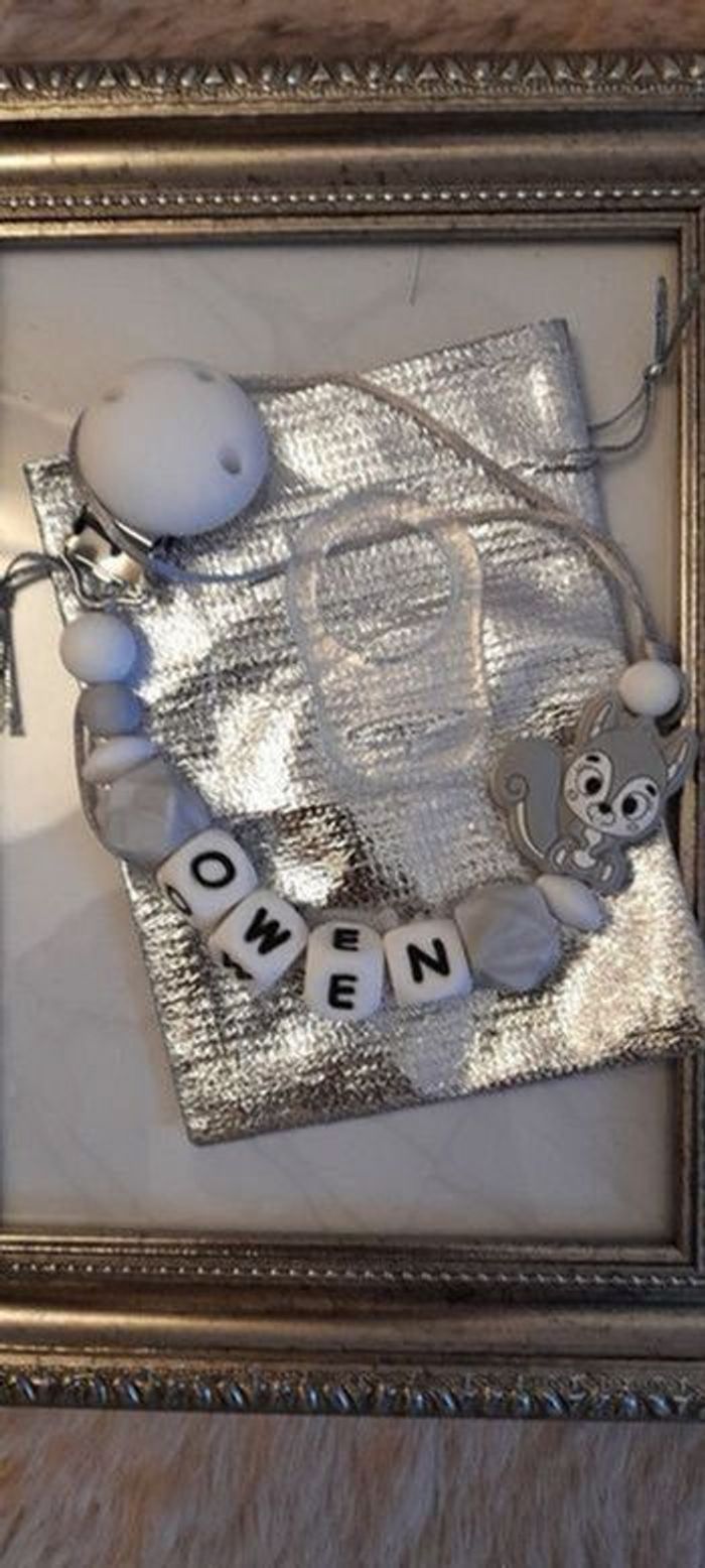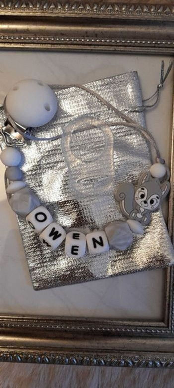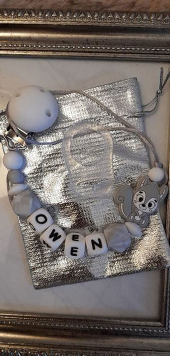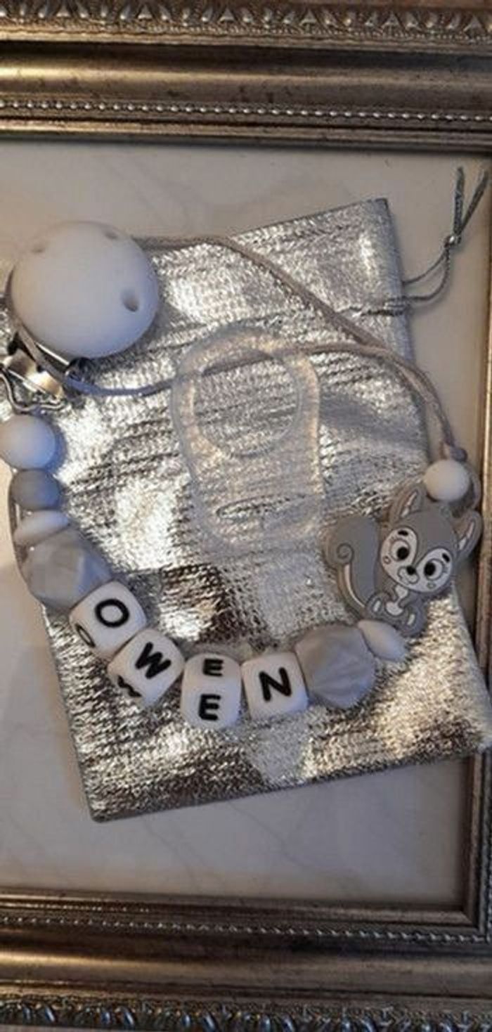 Attache tetine personnalisé avec le prénom de votre choix .offert avec une pochette cadeau et un adaptateur tétine. Réalisation et envoie sous 48h selon le stock le matériel utilisé pour la fabrication est aux normes européennes en respectant les normes de sécurité pour bébé. N'hésitez pas à m'envoyer un message pour plus d'informations et regardez mon compte il y a plusieurs modèles.