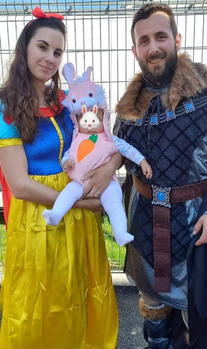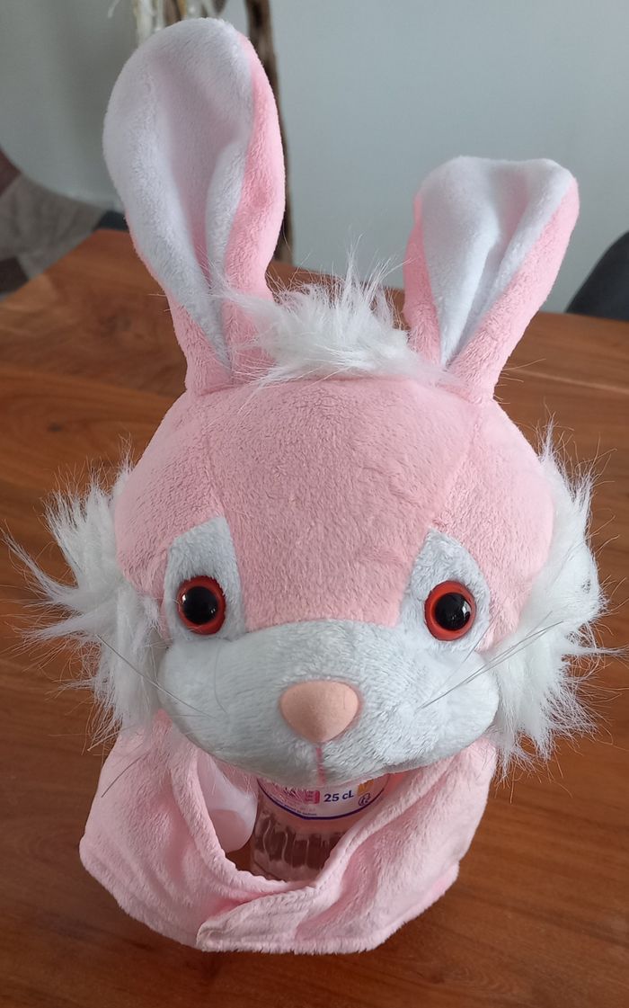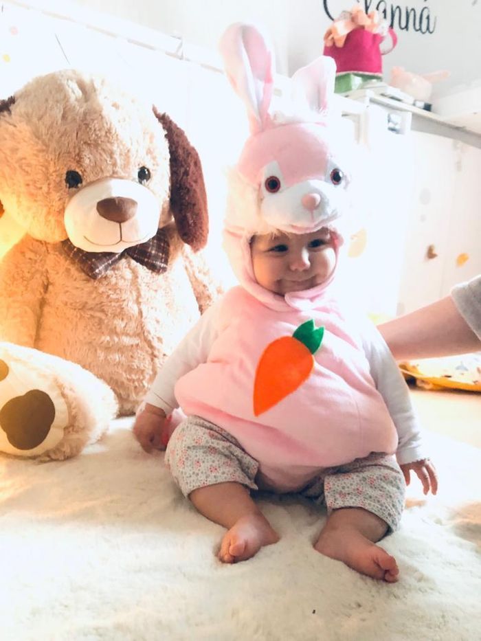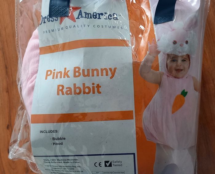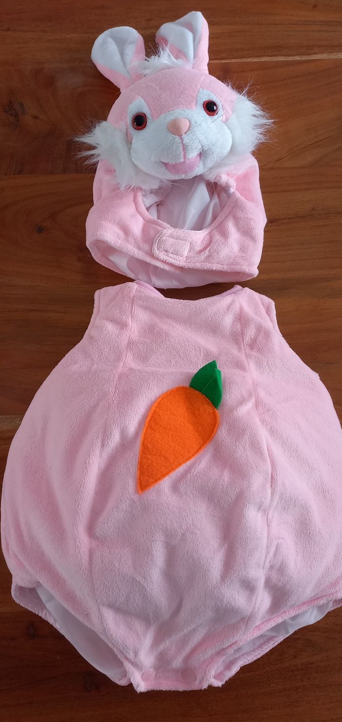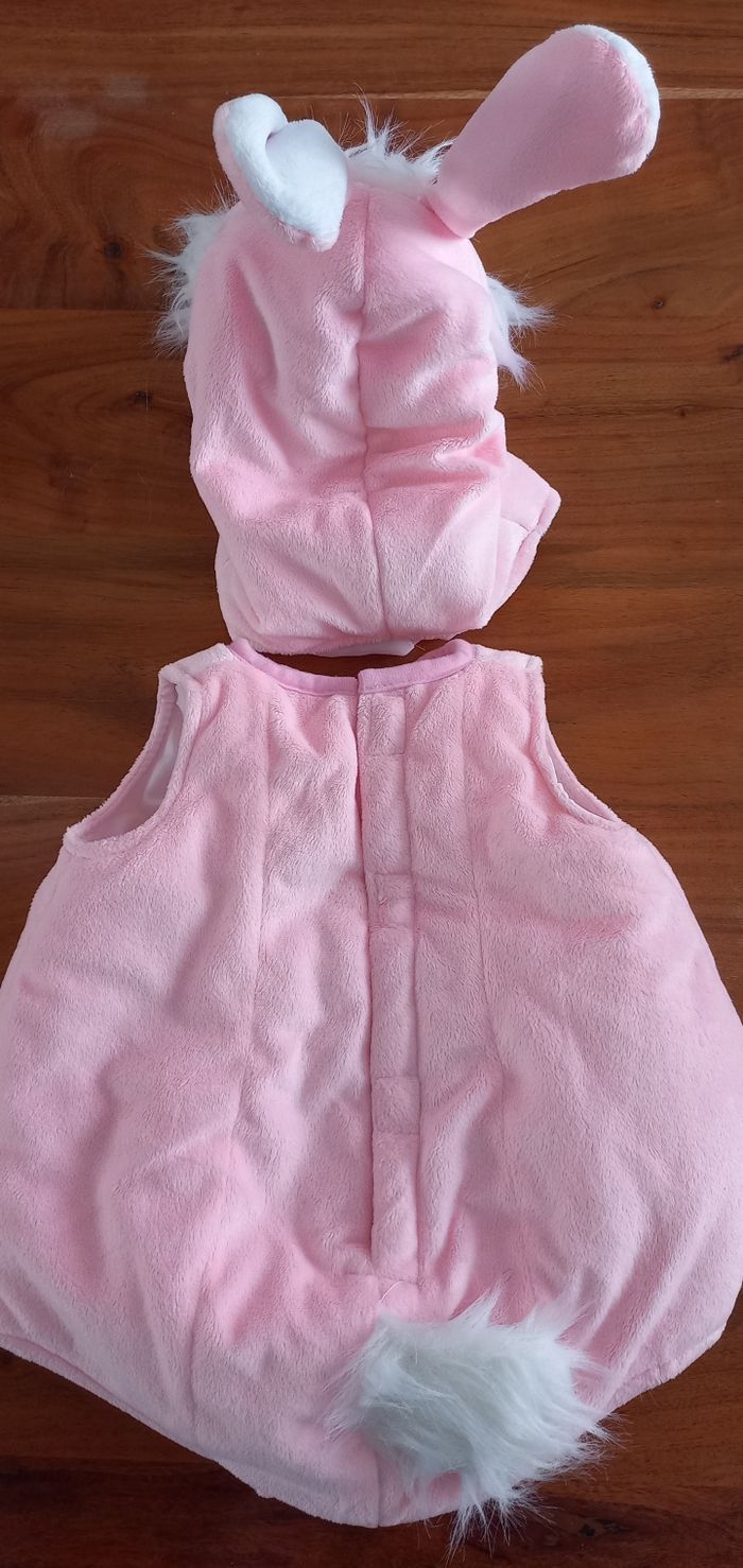 Costume de lapin style américain. Porté deux fois lavé une fois. 0-6 mois: 43-60 cm à 3,6 à 6,8 kg selon l'emballage. Ma fille l'a porté à 8 mois , 8kg et 69 cm, il allait très bien. Je dirai 6-9 mois pour une fille.