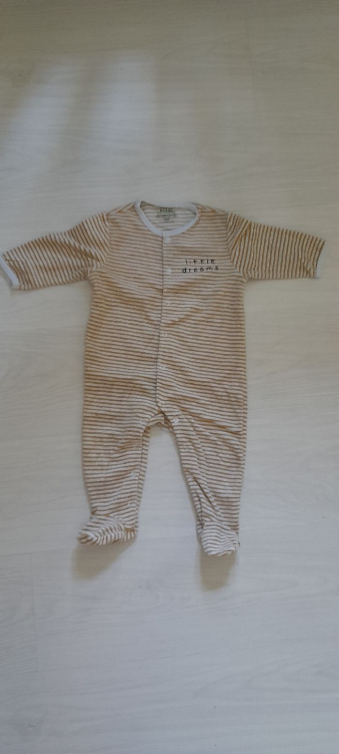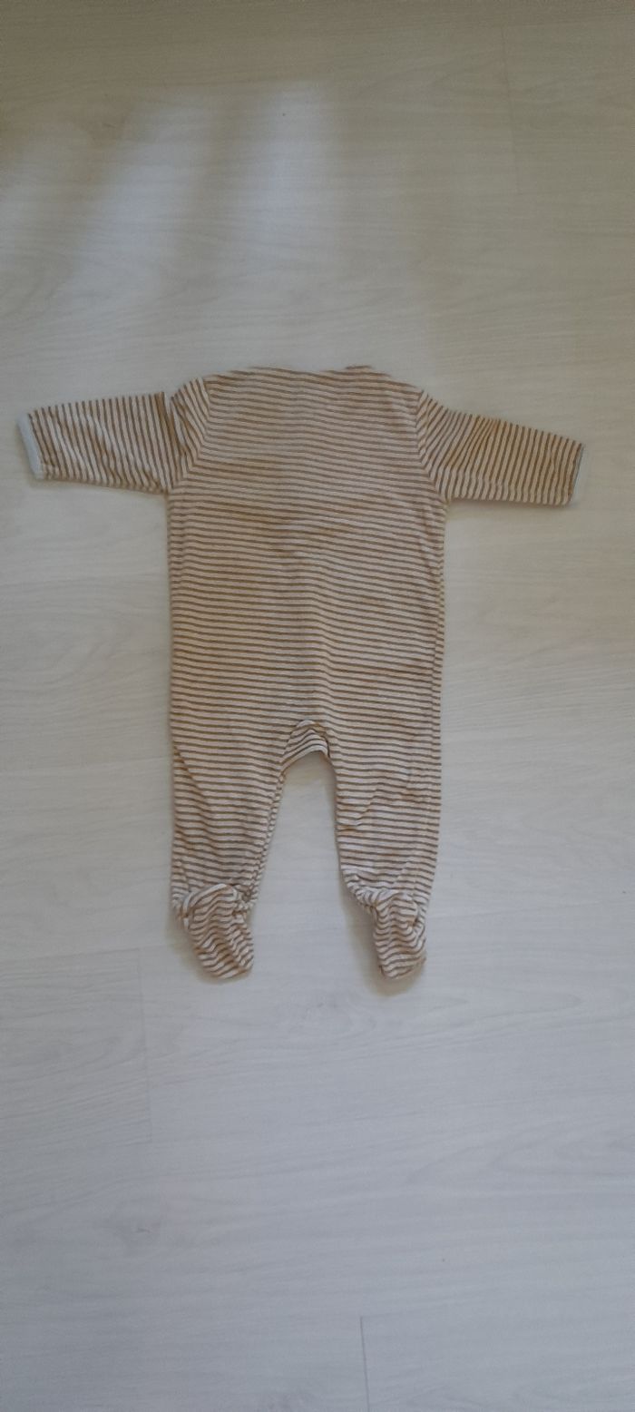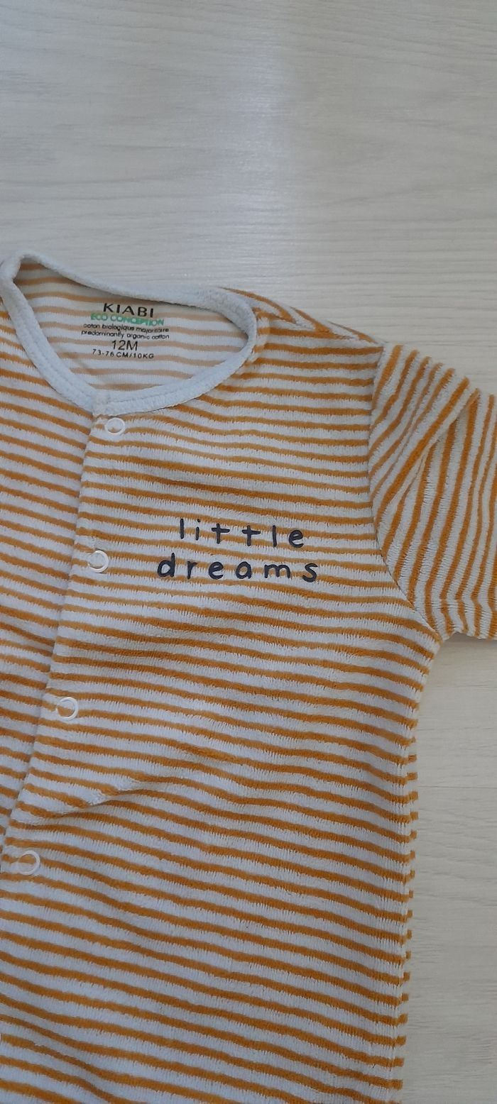 Grenouillère T 12 mois Marque KIABI Couleurs moutarde et blanc cassé Manches longues Attache central et entre jambes pressions Pieds intégrés Inscription devant côté gauche Très très bon état