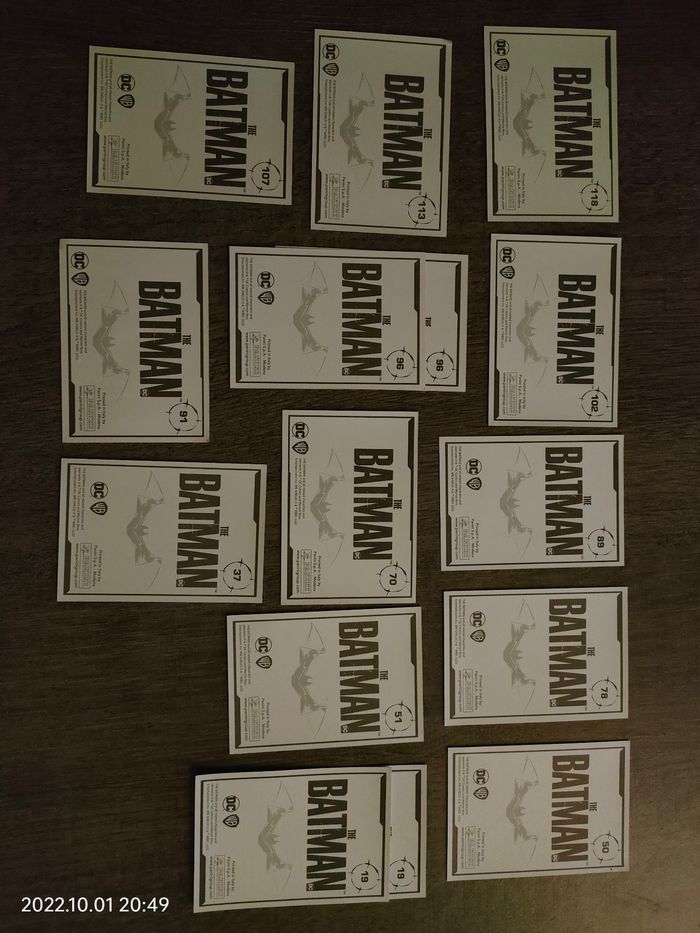 Vend en lot ou carte panini batman 19, 37, 50, 51, 70, 78, 89, 91, 96, 102, 107, 113, 118 5€ le lot ou 0,70€ la carte