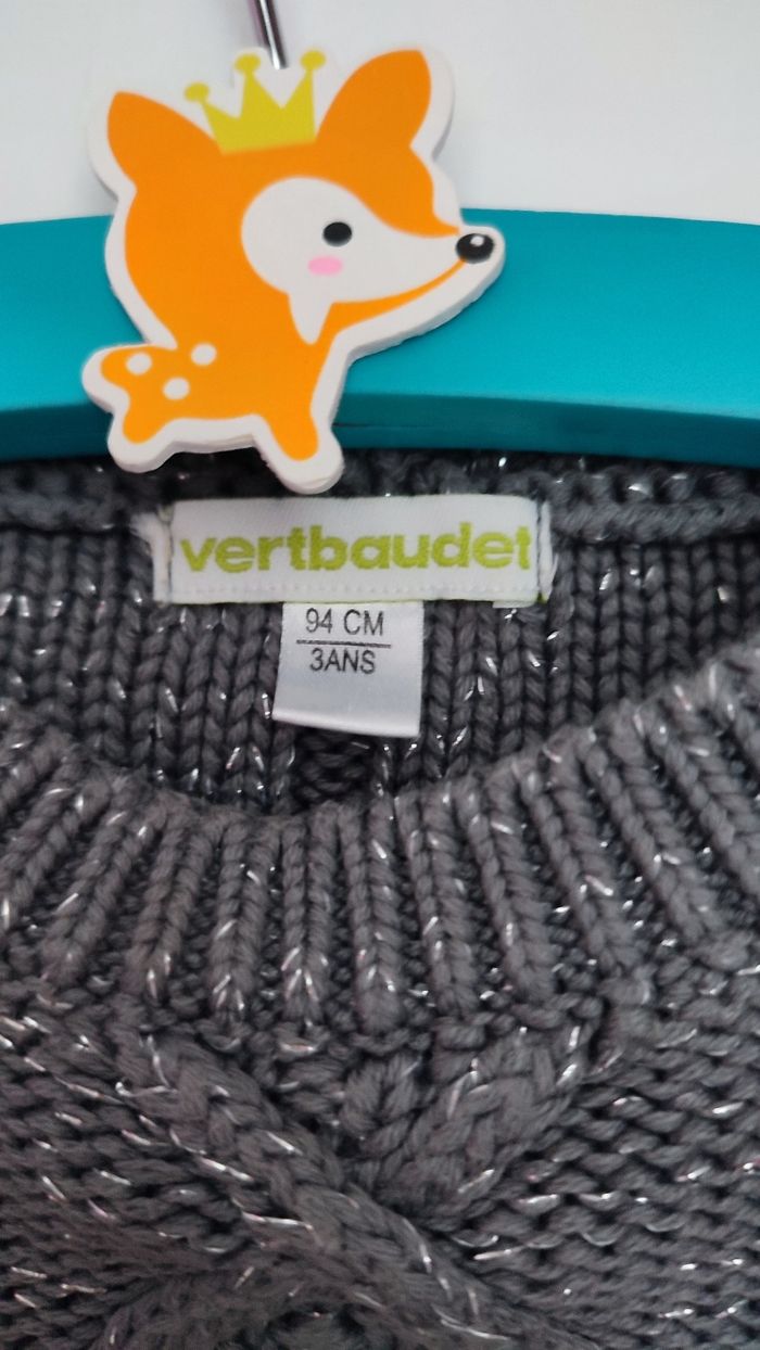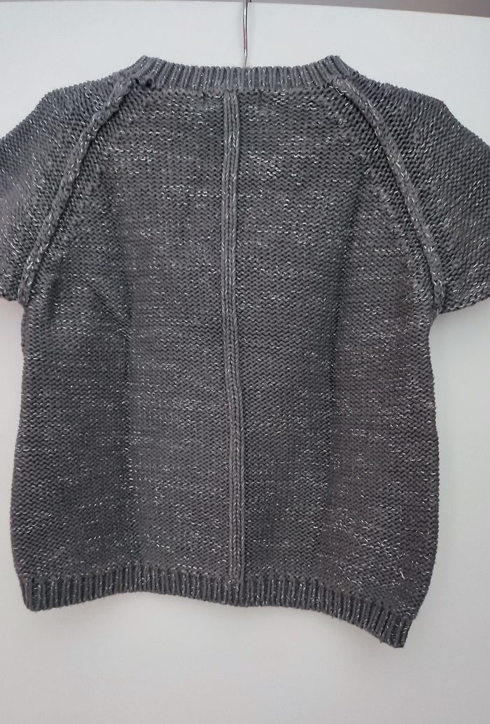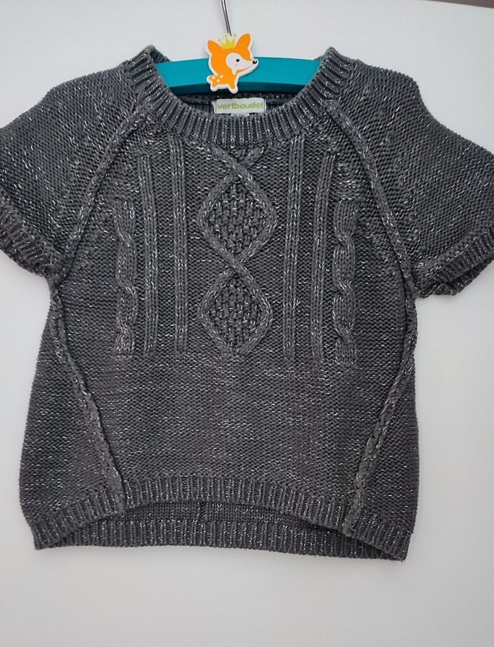 Joli pull manches courtes gris avec fibres métalliques argentées en très bon état. 3 ans .