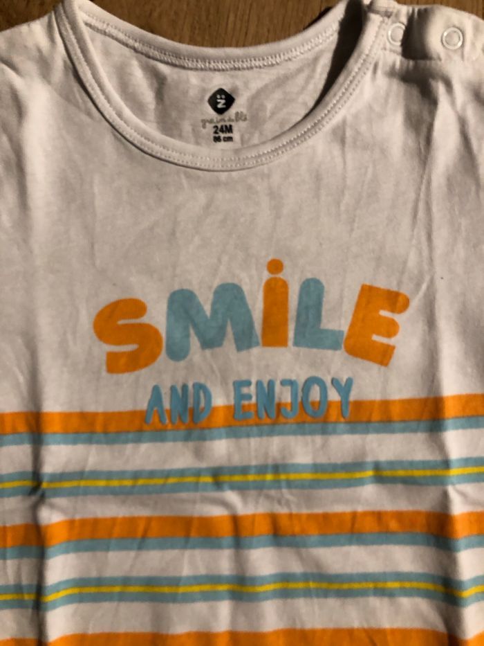 T-shirt blanc avec inscriptions «  smile and Enjoy » En paraît état Taille 24 mois