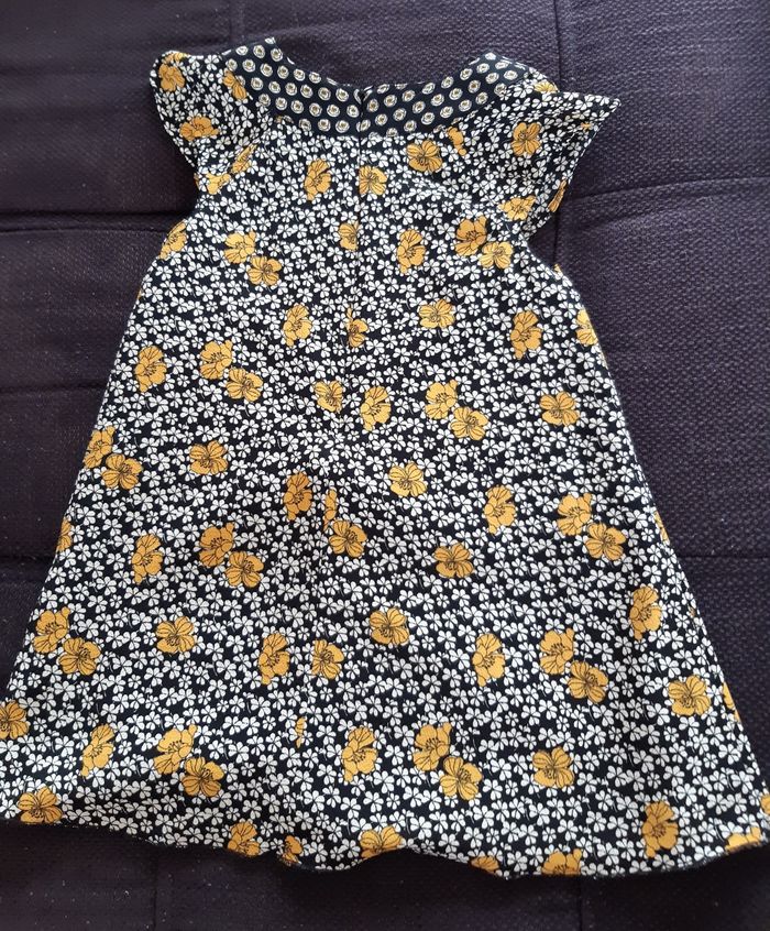 Robe mi saison taille 2 ans de couleur noir avec des fleurs jaunes, manches courtes, fermeture éclair invisible dans le dos. Très bon état, marque orchestra.