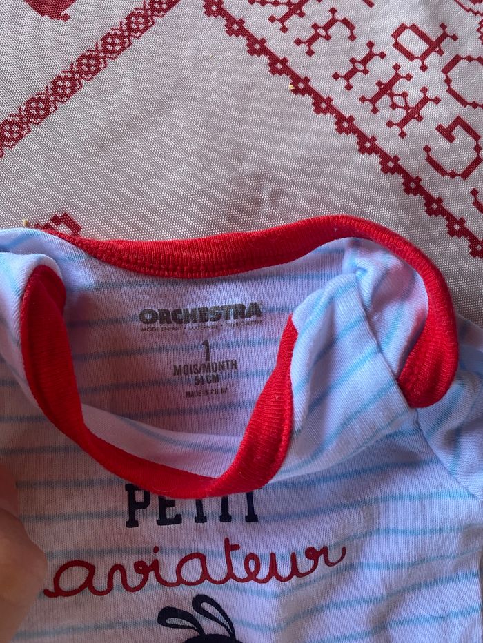Vends 3 body manche longue 1 mois de la marque orchestra En bon état, juste un body abîmé sur le bas voir photo Habitation non fumeuse