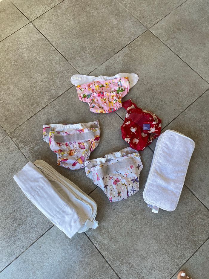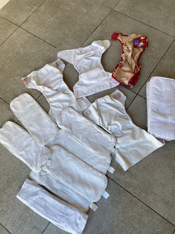 trois couches à poche et une sur couche bambinoMio Les scratchs accrochent très bien encore. Elles sont encore parfaitement étanches. Lavage main le plus souvent, bicarbonate quand ce fût nécessaire et lessive compatible. 6 insert bambou Et 1 preplié coton bambinomio très efficaces 6 absorbants microfibre et 3 booster bambou peu efficaces donc offert Ça peut dépanner 🤷‍♀️. Le lot :25€