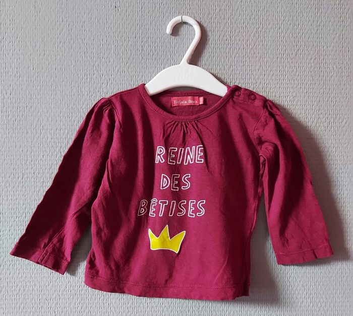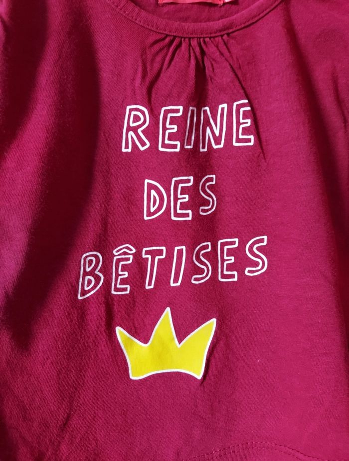 Je vends un pull léger de couleur rouge/bordeaux avec l'inscription " Reine Des bêtises " de la marque Tassaia Basics. Des boutons à pression sont présents près du cou pour facilité le passage de la tête. Taille : 18 mois. En très bon état.