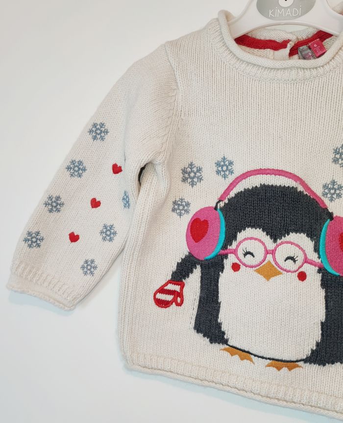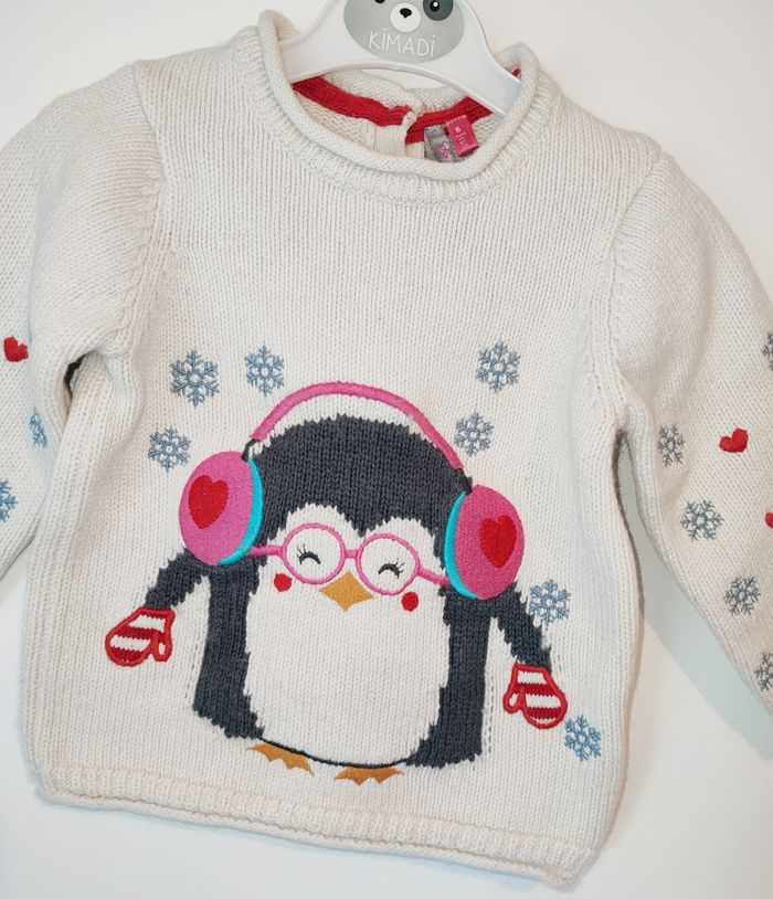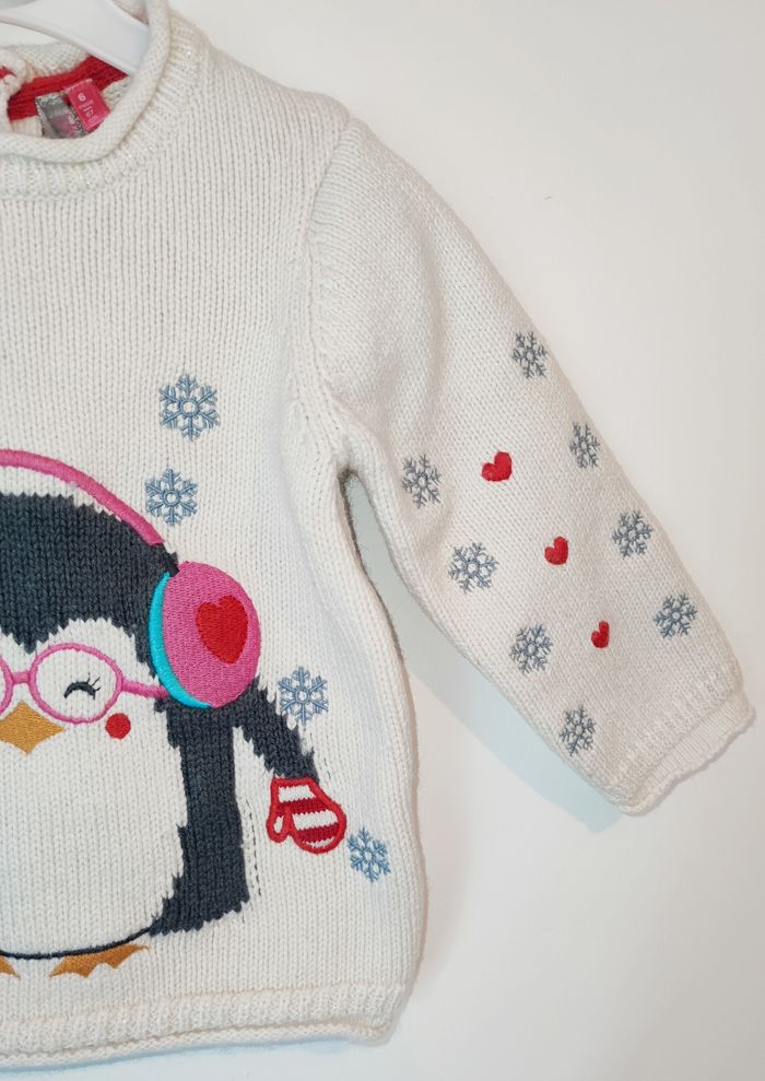Pull hiver de la marque ORCHESTRA - Crème/ Blanc cassé - En maille - Col rond - Motif "Pingouin" tricoté - Ouverture pressionnée dans le haut du dos - Manque l'étiquette de la composition - Taille 6 mois ❌ Excellent état