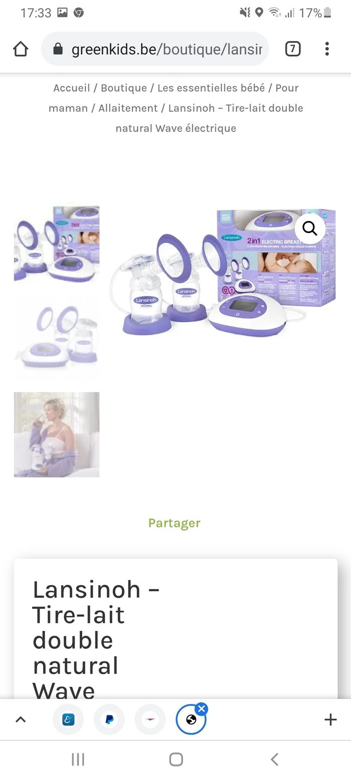 Tire lait lansinoh double pompage neuf peu encombrent efficace et rapide parce que c ets un double pompage acheté un y a 3mois a 219€ servie 3 fois avec ca boîte d origine tout c est accessoire ... juste quelque légère griffe dessus