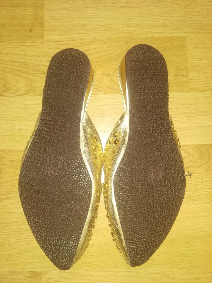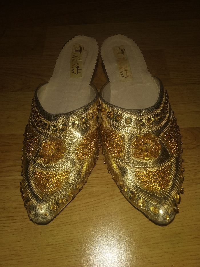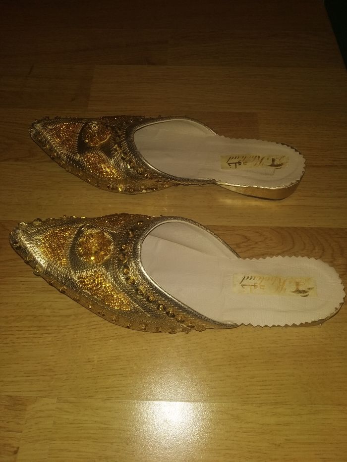 Babouches fille de couleur doré avec des perles doré. Mesure 22 cm a l'intérieur Ma fille les a juste utilisé quelques fois à la maison. Elles sont pratiquement neuves. Les bouts sont un peu usés voir photo.
