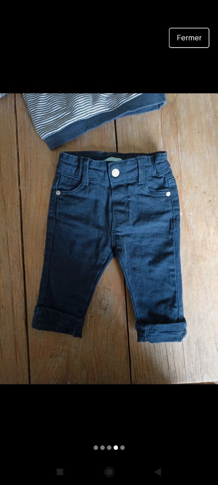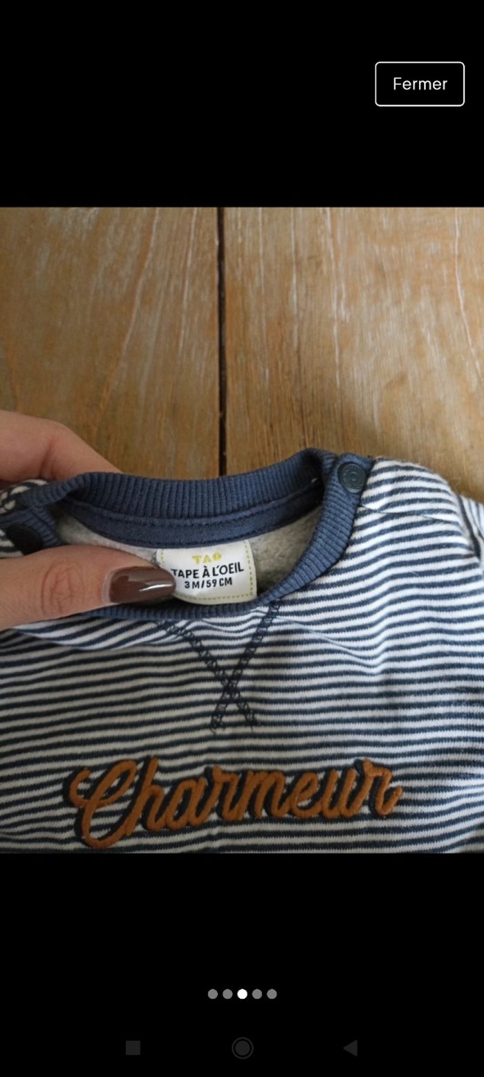 Sweat rayé bleu et blanc avec inscription, marque Tape à l'oeil Pantalon bleu marine marque Obaïbi 3 mois