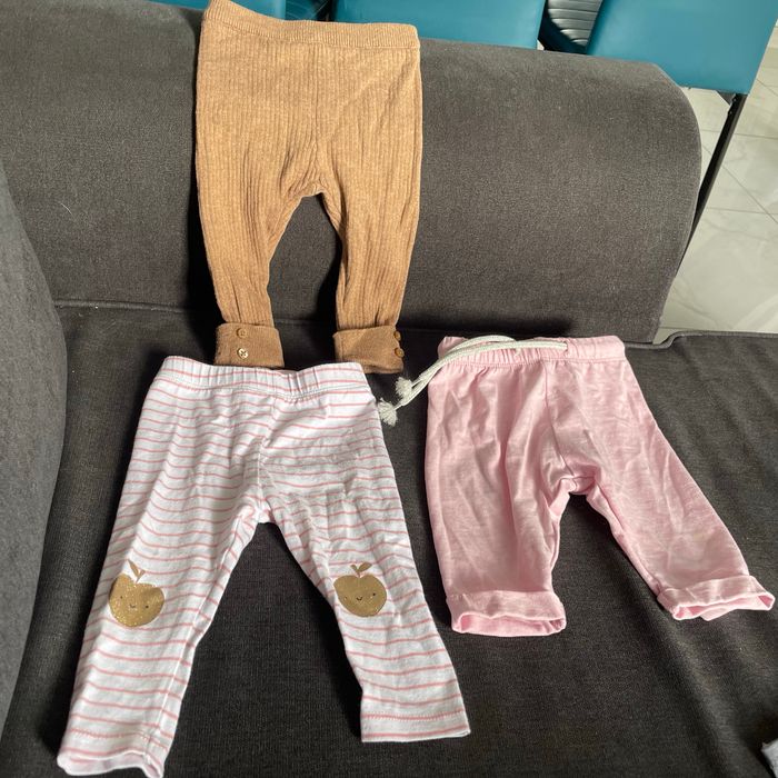 Mot de 3 legging 3 mois fille( 1 marron, 1 tout rose , rose et blanc pomme sur les genoux pailleté )