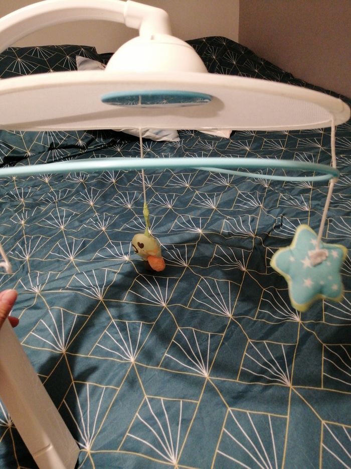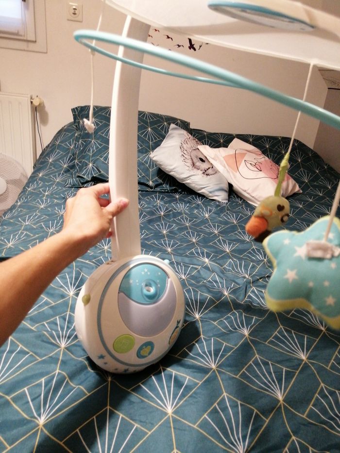 Mobile avec suspension Peut se visser aux barreaux du lit Fait de la musique et des images au mur Manque un petit doudou qui pend mais peut être remplacé par n importe quoi d autre car toujours l accroche Bon état fonctionne très bien encorechi