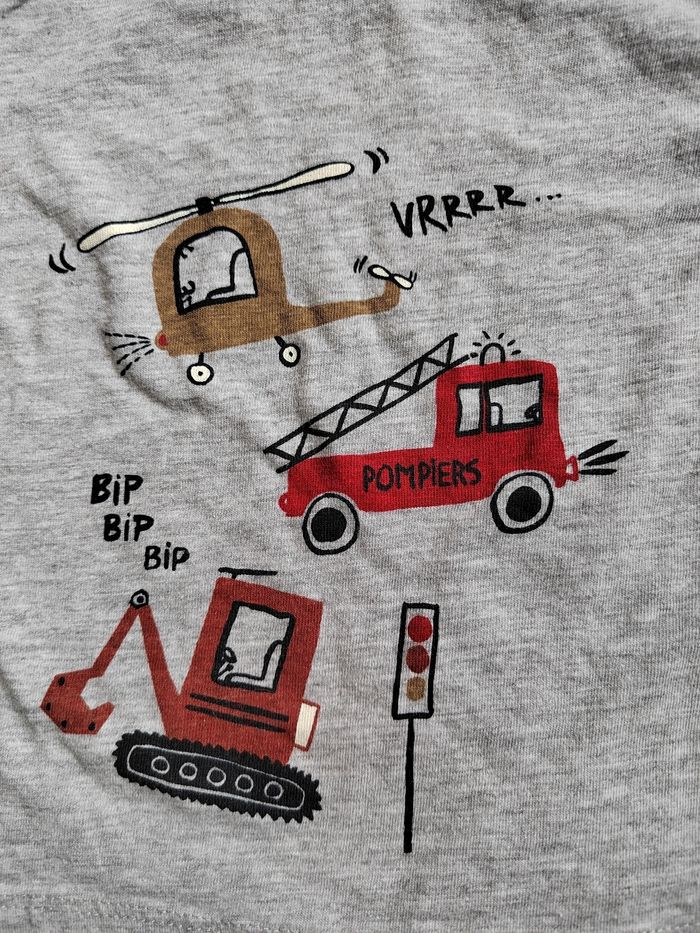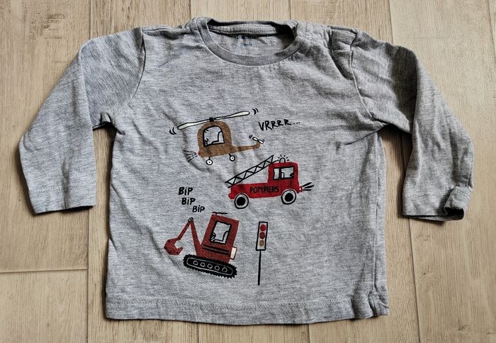 Tee-shirt manches longues motif hélicoptère 🚁 , camion de pompier 🚒 et tractopelle, gris en parfait état. Taille 9 mois Prix : 2 €