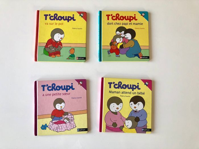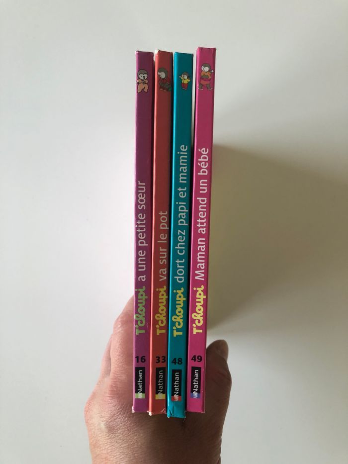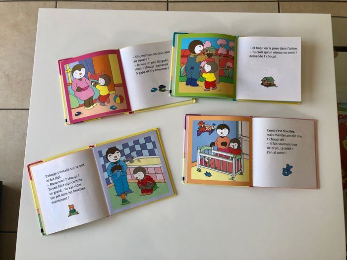 Vends 4 livres t’choupi Il ne manque aucune page mais obligé de mettre du scotch pour tenir la couverture avec le reste du livre.