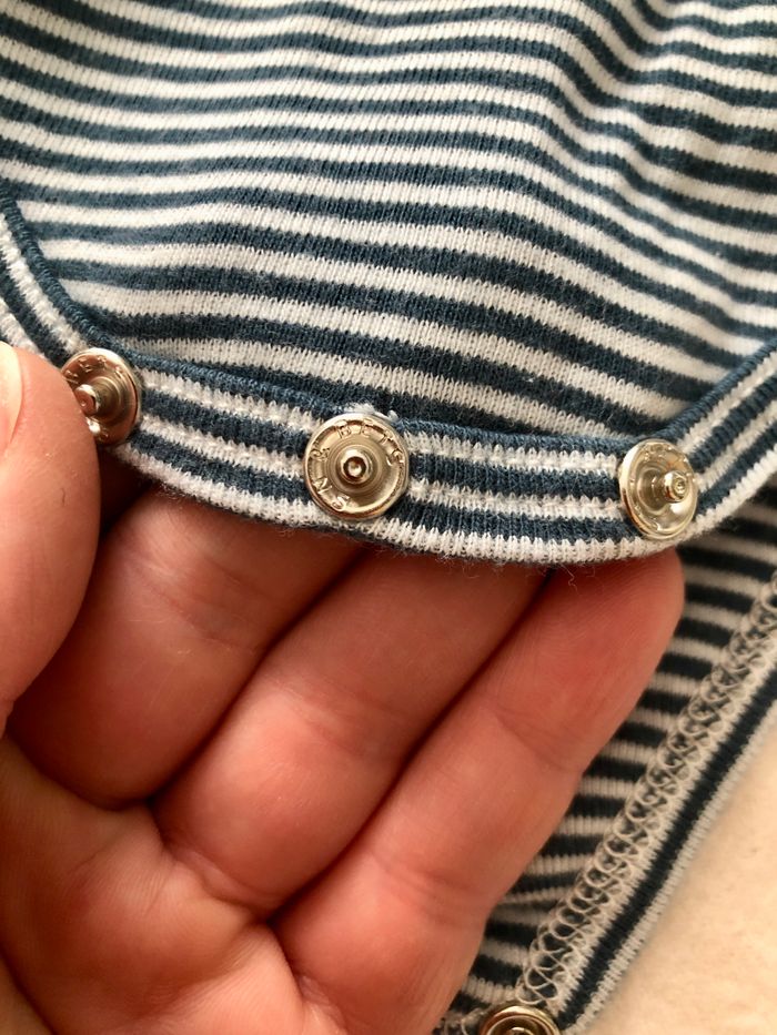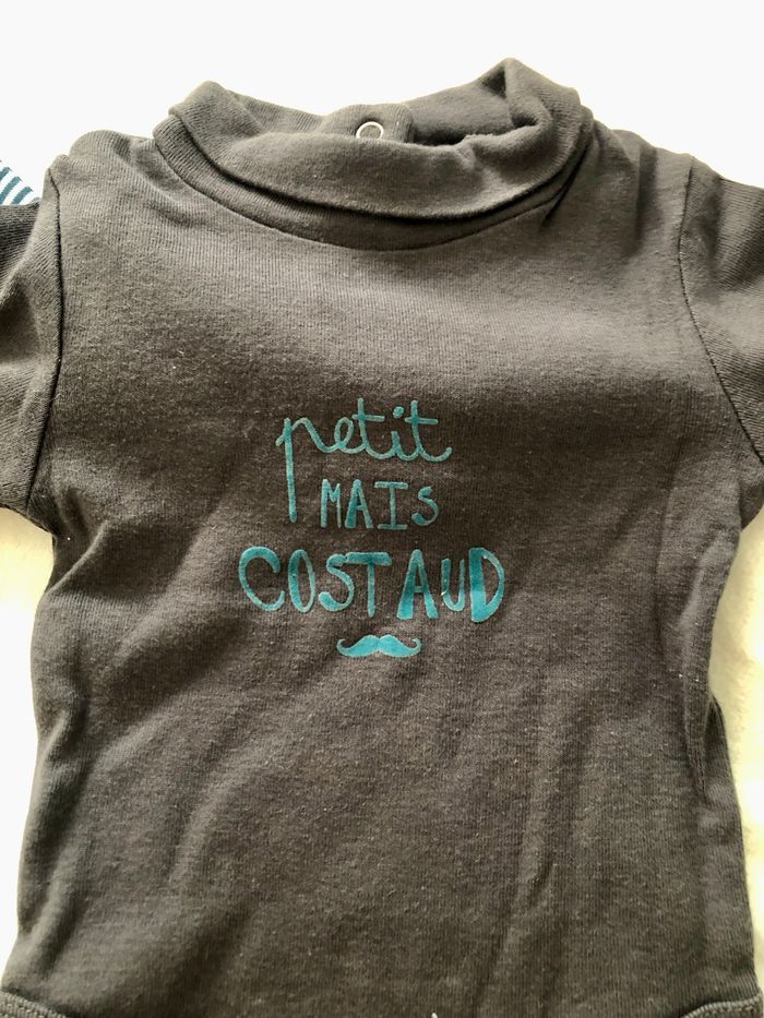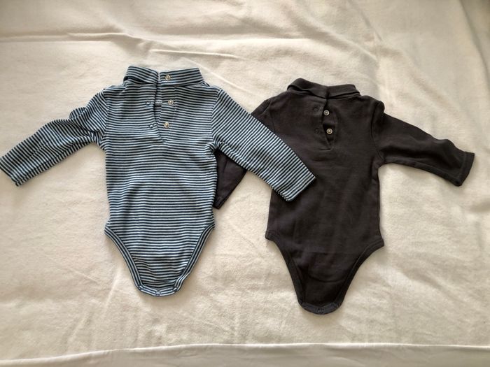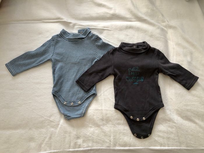 Deux bodies manches longues et col roulé Un gris foncé avec texte en bleu canard Un body rayé blanc et bleu marine Le body rayé a un tout petit trou au niveau d’une pression (voir photo)