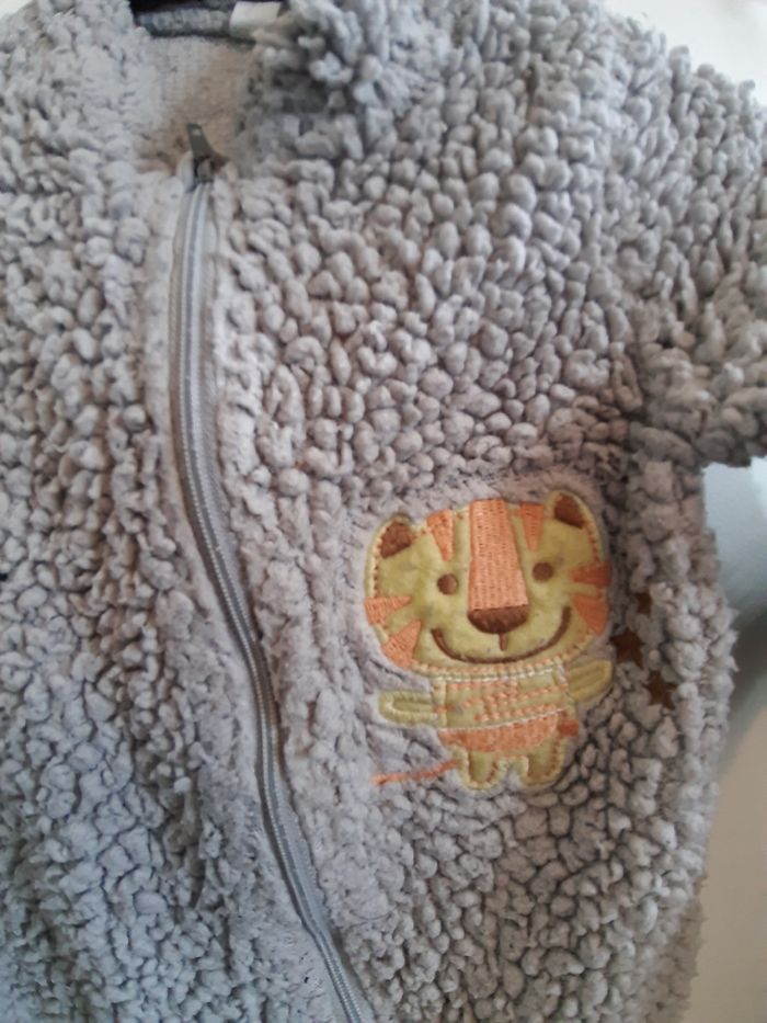 Pyjama effet mouton, qui tient bien chaud. Il se ferme par une fermeture éclaire devant.