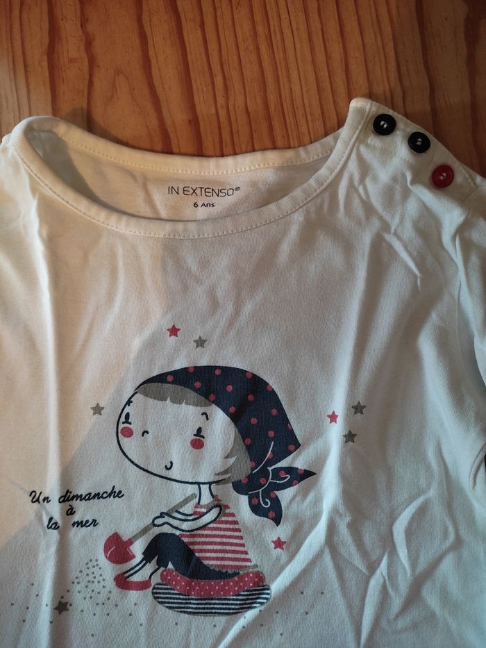 Tee shirt blanc avec motif et boutons. Marque IN extenso.Bon état.6 ans.(manque un petit coup de fer)😉.