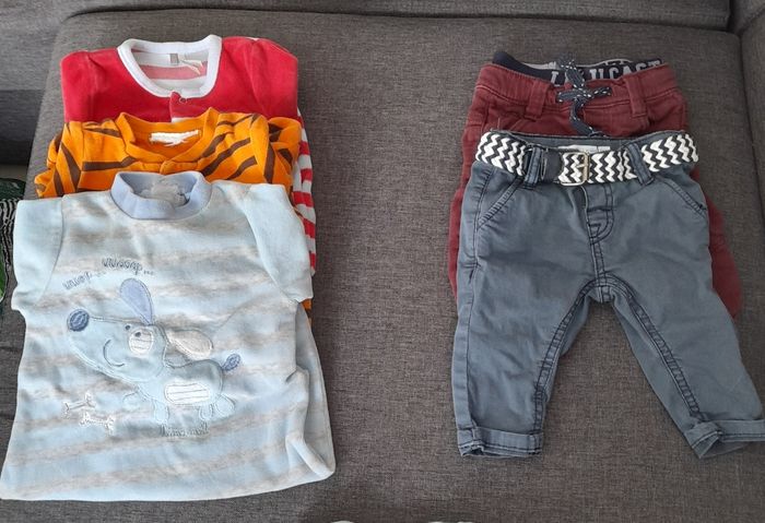 Bon etat général. 9 pièces. 1 pyjama état moyen (le rouge) à les dessins qui se sont un peu craquelés. Donne en plus 3 pièces (1 body légèrement taché en bas, 1 pantalon décoloré, une salopette matière chaude car 1 tache)