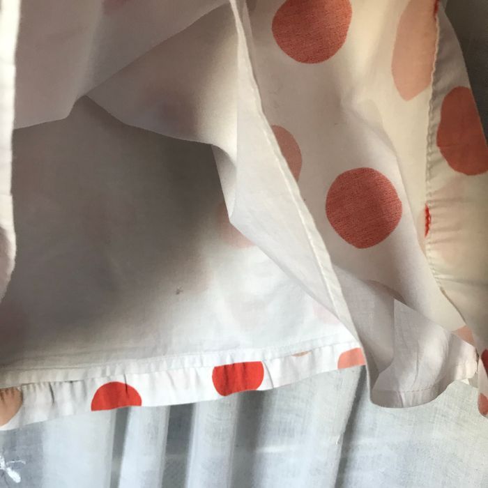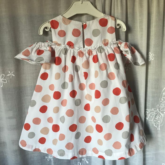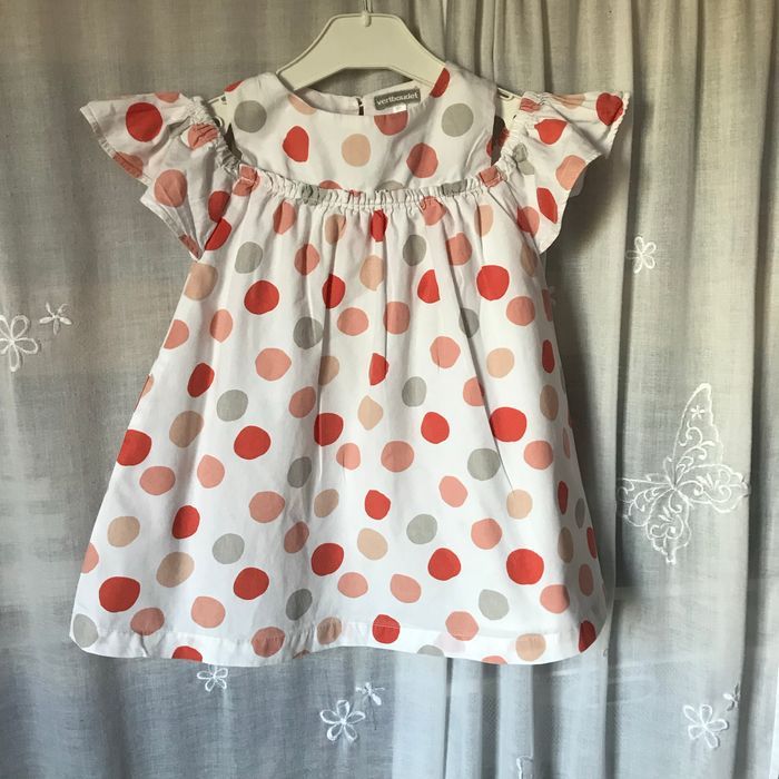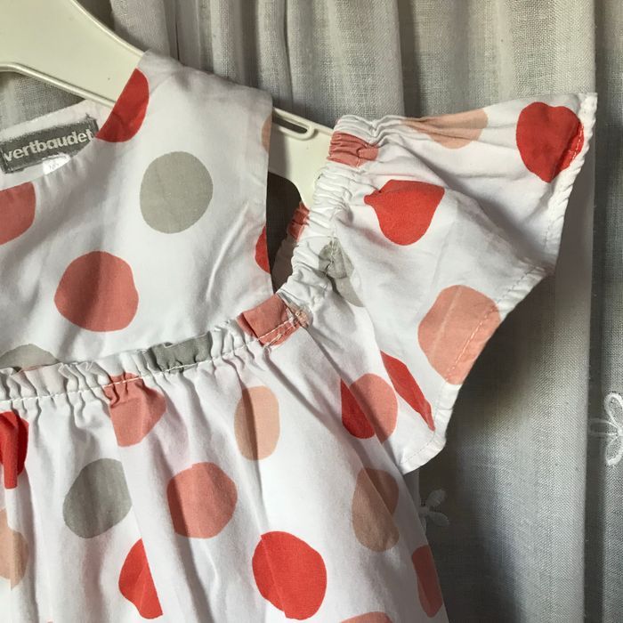 Très jolie robe chasuble, épaules découvertes, volants tombants sur les bras Coton blanc, gros ronds saumon abricot et gris Entièrement doublée Taille 4 ans 102 cm Vertbaudet