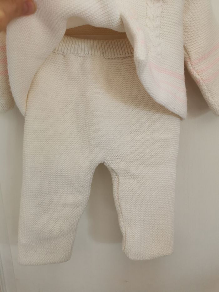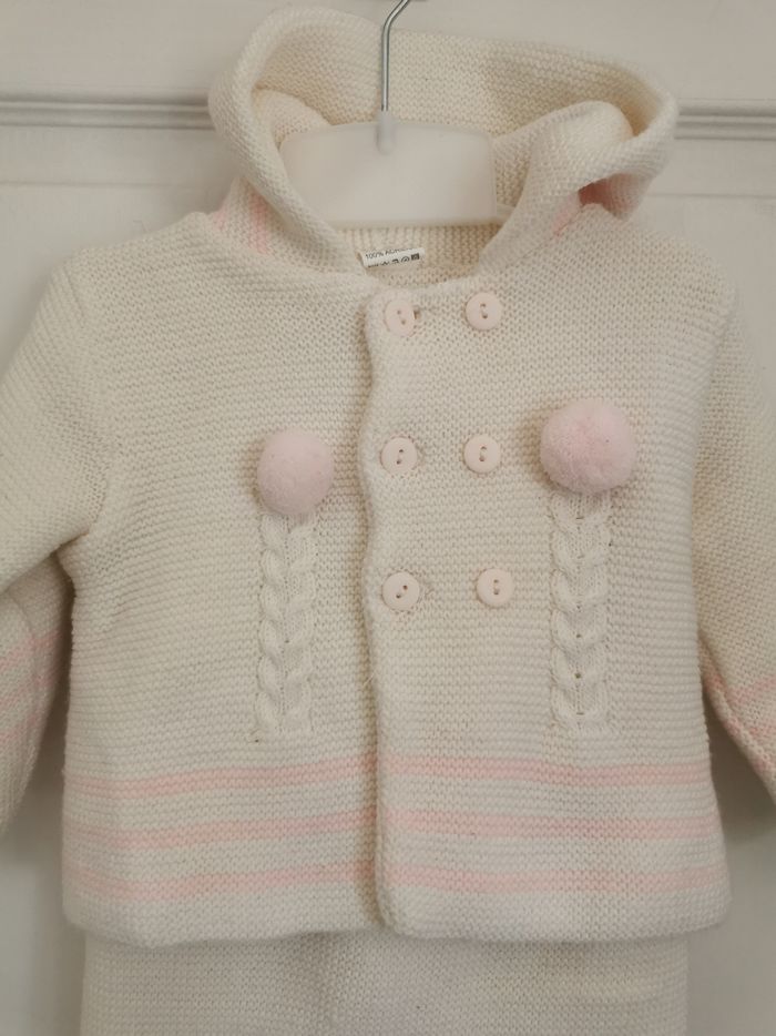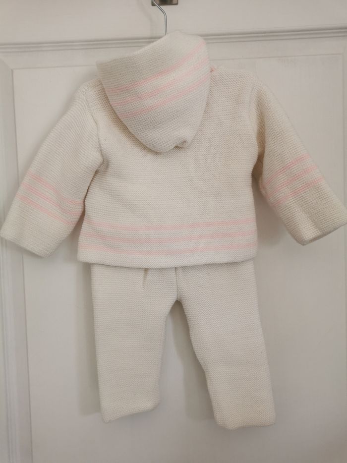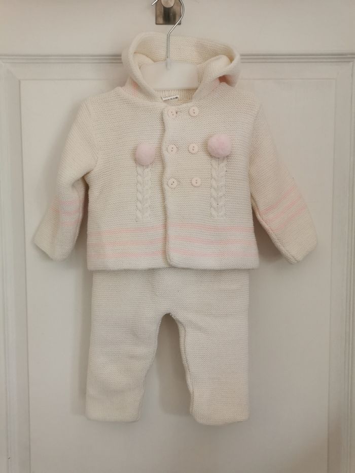 Ensemble bébé en maille tricot blanc et rose à pompons. C'est une taille 6mois il est neuf juste lavé car il ne correspondait à la saison pour ma fille. Il est en acrylique.
