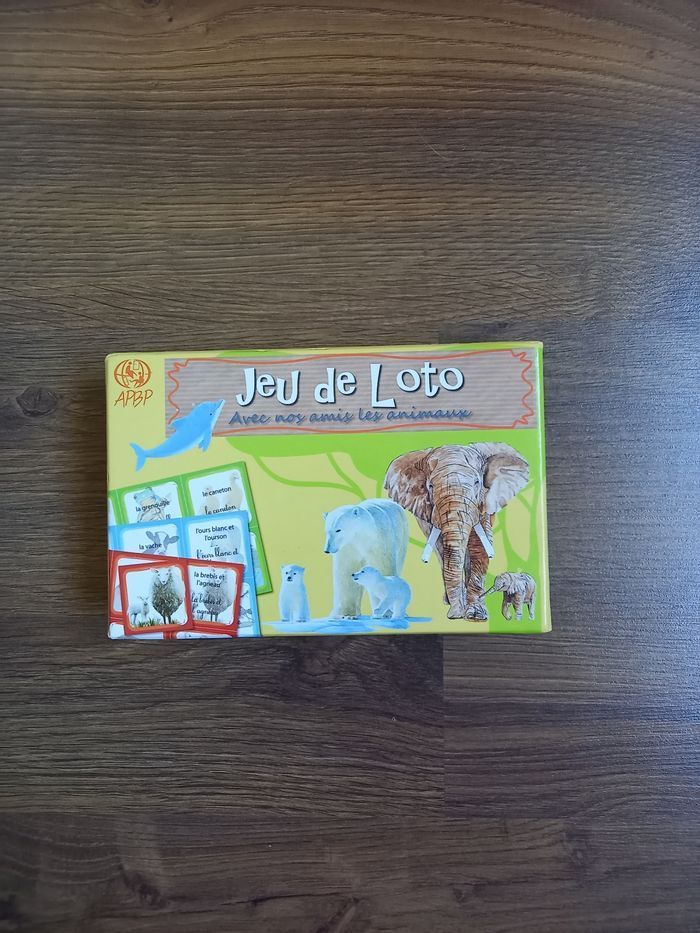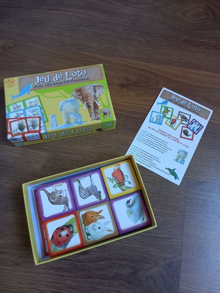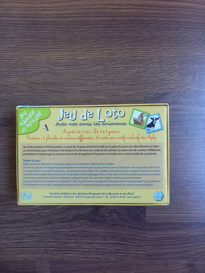Jeu de loto avec nos amis les animaux Composé de 6 planches et 36 cartes A partir de 4 ans de 1 à 6 joueurs Marque APBP État neuf.