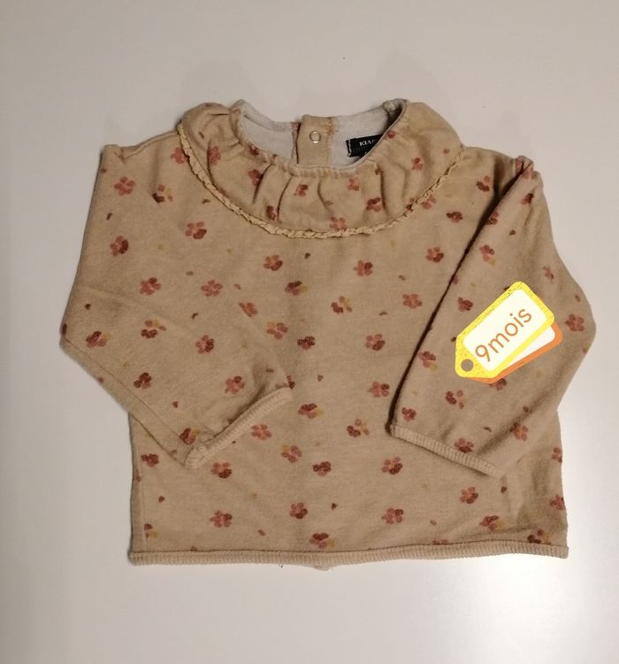 Haut filles kiabi. 9mois /69-72cm. Beige avec des motifs. Manches longues, petit coll. Ouverture totale derrière, des boutons clipse. 76%viscose. 21%polyester. 3%elasthane. Porté une fois. 4.50€