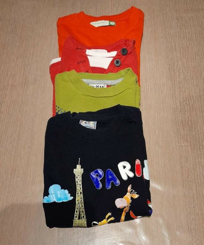 Lot de 4 t-shirts garçon. Taille 86. 2 premaman, 1 la compagnie des petits. Bon état. Maison non fumeur