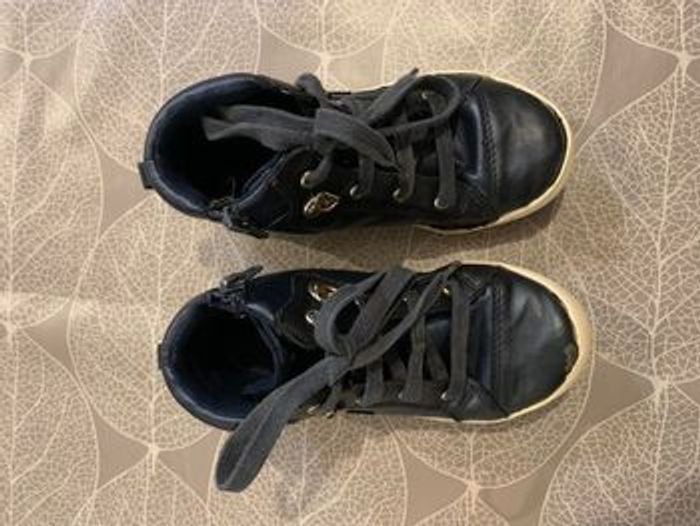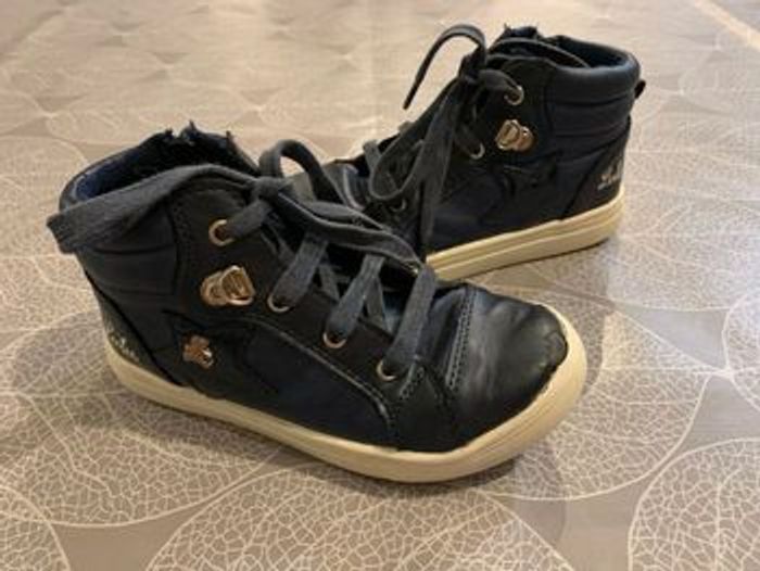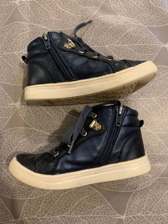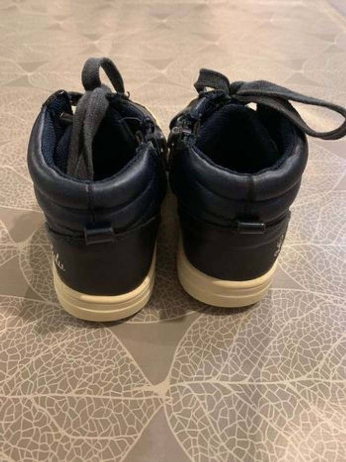 Bleu marine Intérieur en très bon état Extérieur les bouts sont un peu abîmés Forme basket Fermeture + lacets Offert pour l’achat d’un lot 😉