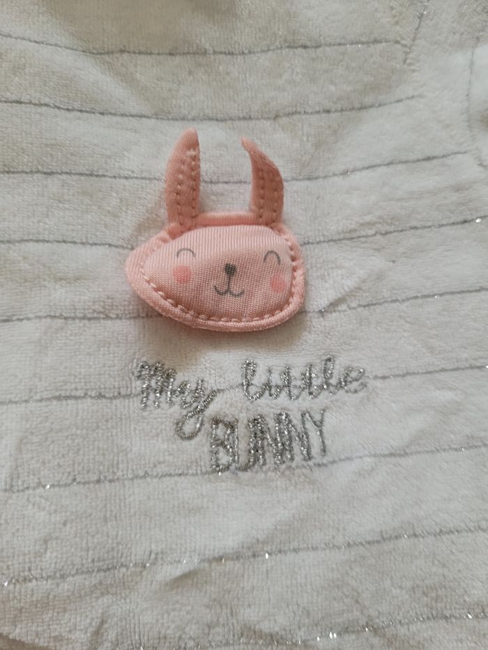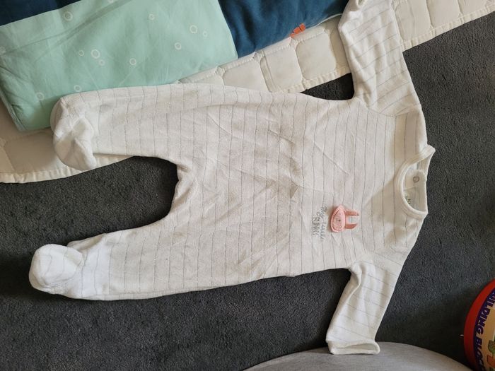 Pyjama blanc à rayures argentées avec tête de lapin rose en relief