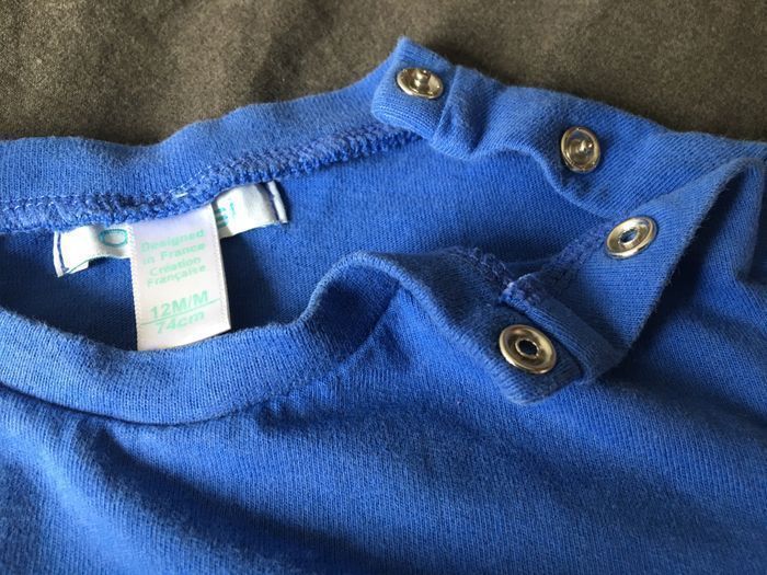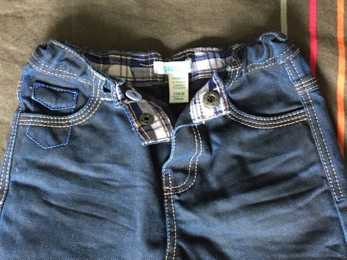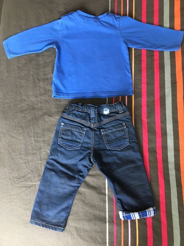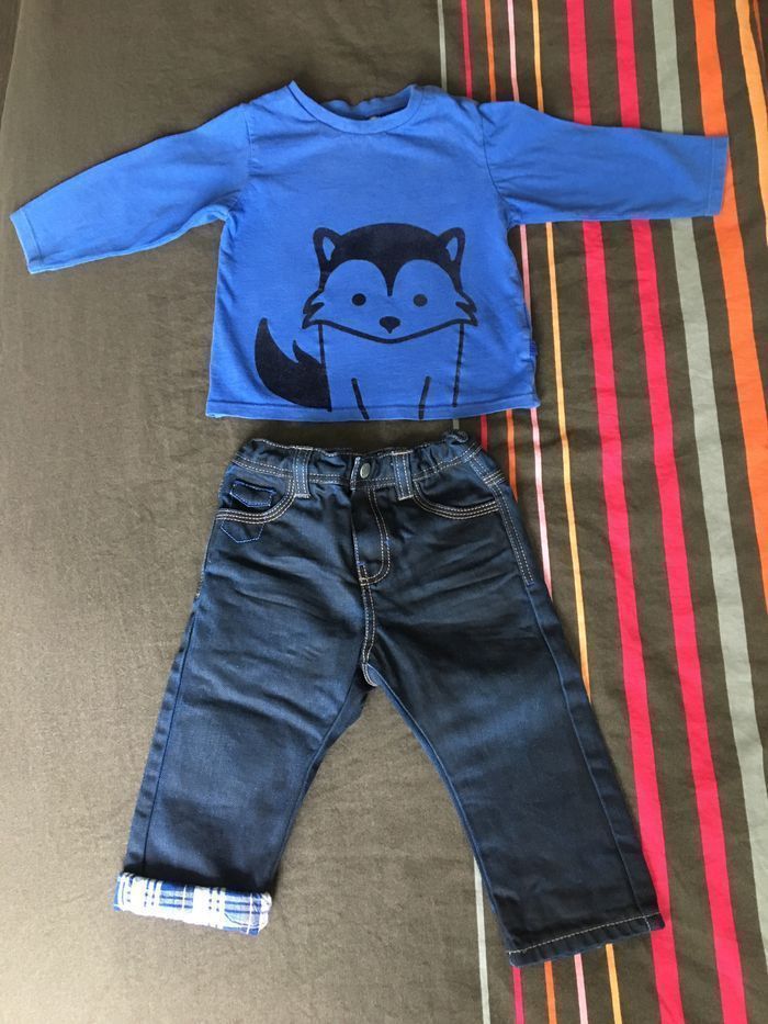 Ensemble Obaïbi garçon 12 mois (74 cm) comme neuf (première main). Tee-shirt manches longues avec 2 pressions à l’encolure et jeans enduit entièrement doublé avec taille réglable avec élastiques. (Pantalon acheté 22,99 € et teeshirt 6,99 € neufs .) En très bon état , proche du neuf car très peu portés. Maison non fumeurs et sans animaux. Envoi rapide et soigné.