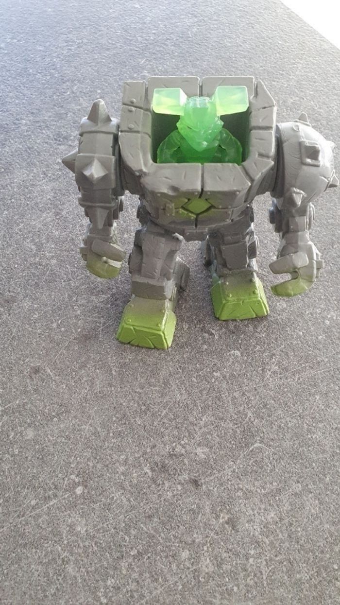 Cyborg de pierre avec plusieurs personnages dont 1 qui brille dans le noir
