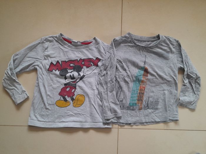 Lot de 2 tee-shirts manches longues taille 5 ans. L'un de marque Disney, l'autre de marque kiabi. Le dessin de Mickey est un peu abîmé, suite aux différents lavages. Possibilité de vendre séparément.