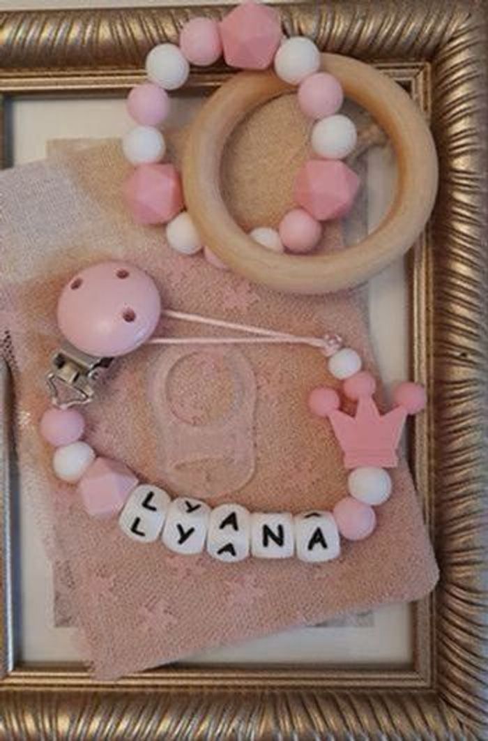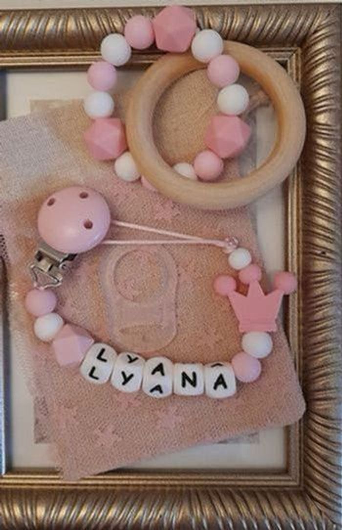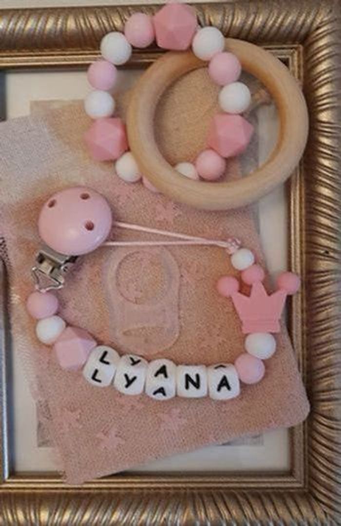 Ensemble attache tétine personnalisé et anneau de dentition avec adaptateur et pochette cadeau. Réalisation et envoie sous 48h salon le stock disponible. Tout le matériel utilisé est aux normes européennes . Perles en silicone ou en bois ou un mélange selon les modèles . En respectant les normes de sécurité pour bébé ,n'hésitez pas à regarder dans mon dressing il y a plusieurs modèles et aussi à m'envoyer un message pour plus d'informations. 🔴 une petite remarque pour les prénoms qui sont très long il y aura forcément moins de perles sur les cotés ou quelques changements sur le modèle c'est pour respecter les normes de sécurité pour bébé il y a une langueur à respecter merci pour votre compréhension. 🔴Aussi l'utilisation de l'attache doit être sous surveillance et toujours vérifier si l attache tétine est intacte et les nœuds sont toujours bien fermés pour la sécurité de nos boutchous. Je vous remercie pour la lecture de ces consignes.