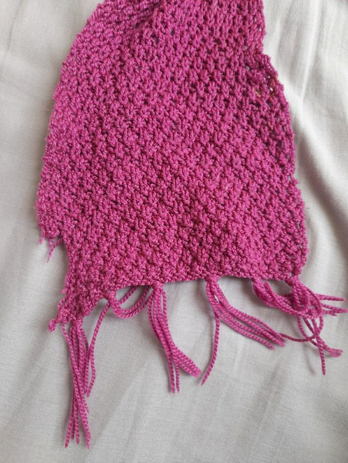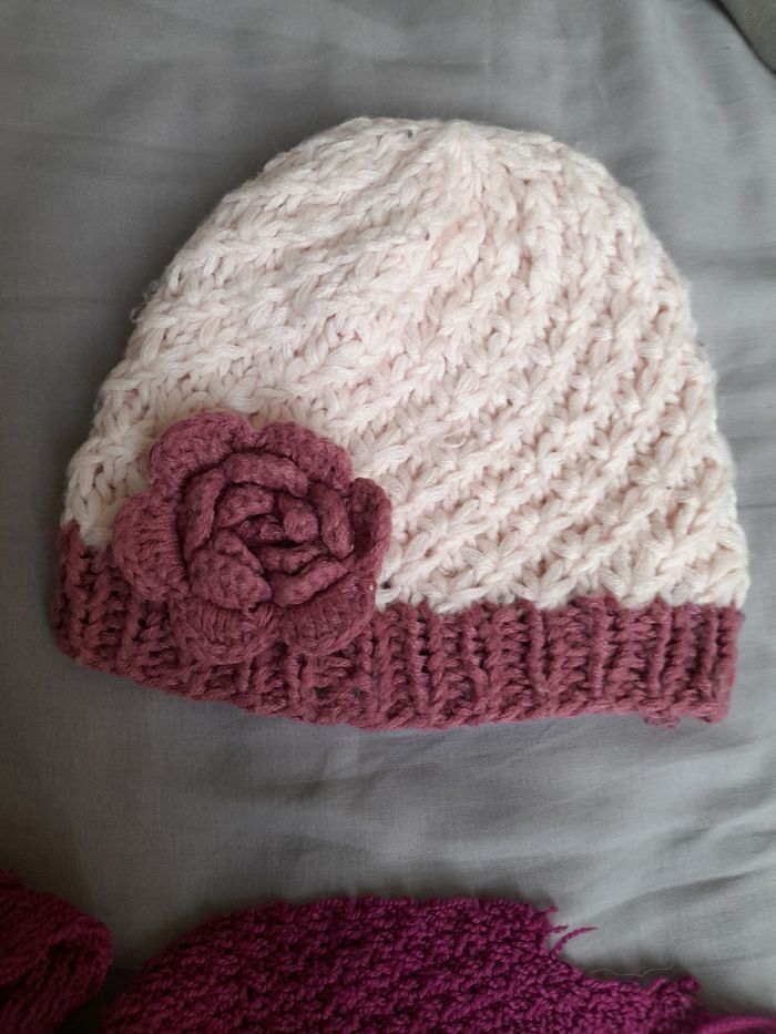 Echarpe et bonnet non coordonnés car pas tout a fait le même rose Echarpe un peu abimee, voir photo