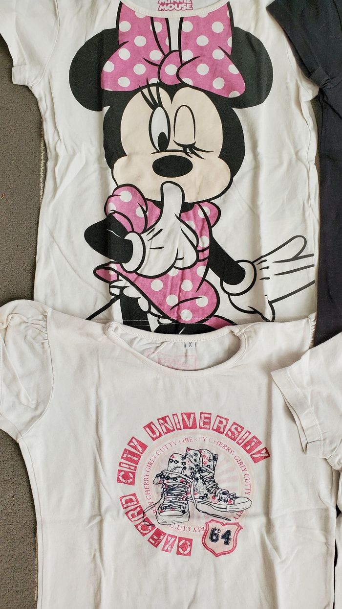Lot de t-shirts 8 ans, celui avec les baskets taille 10 ans mais il correspond plutôt à un 8 ans comme les autres. TBE.