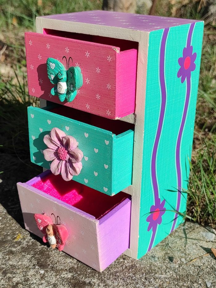 Petite boite à bijoux avec trois tiroirs hauteur 19cm ,largeur 11, profondeur 8.toutes les parties décorées neuve