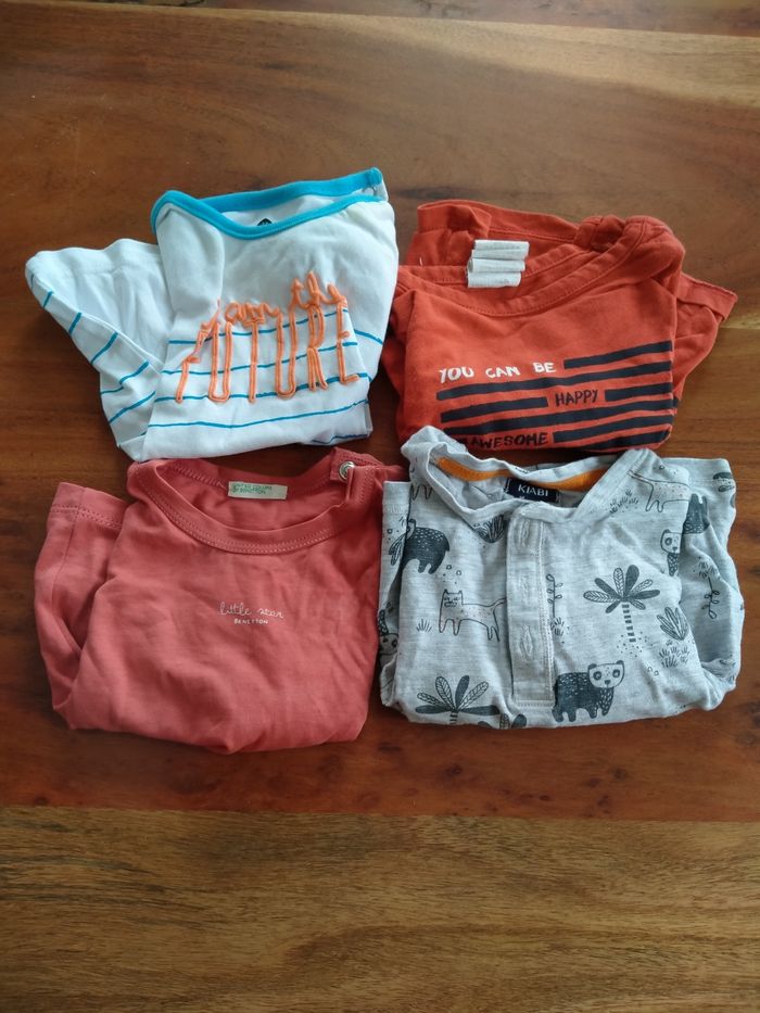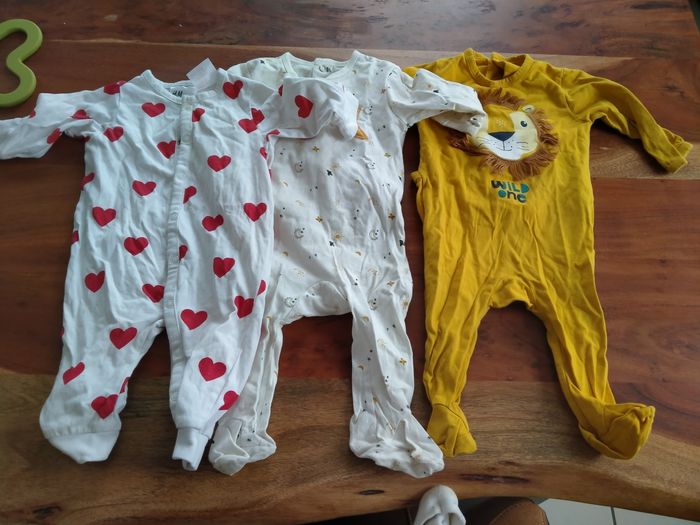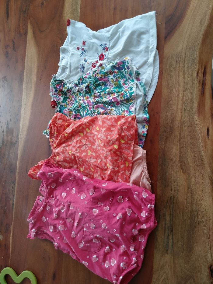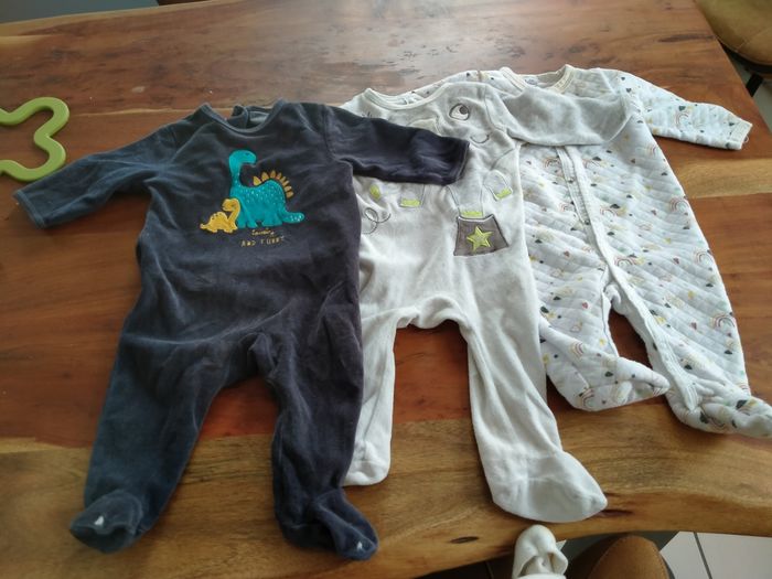 Le lot contient: 3 tuniques 1 barboteuse 3 body 2 pantalons 4 tee shirt manches longues 3 dors bien 3 pyjamas velours Marques diverses Certains vêtements sont un peu déchiré à cause du retrait de l'étiquette cousu.