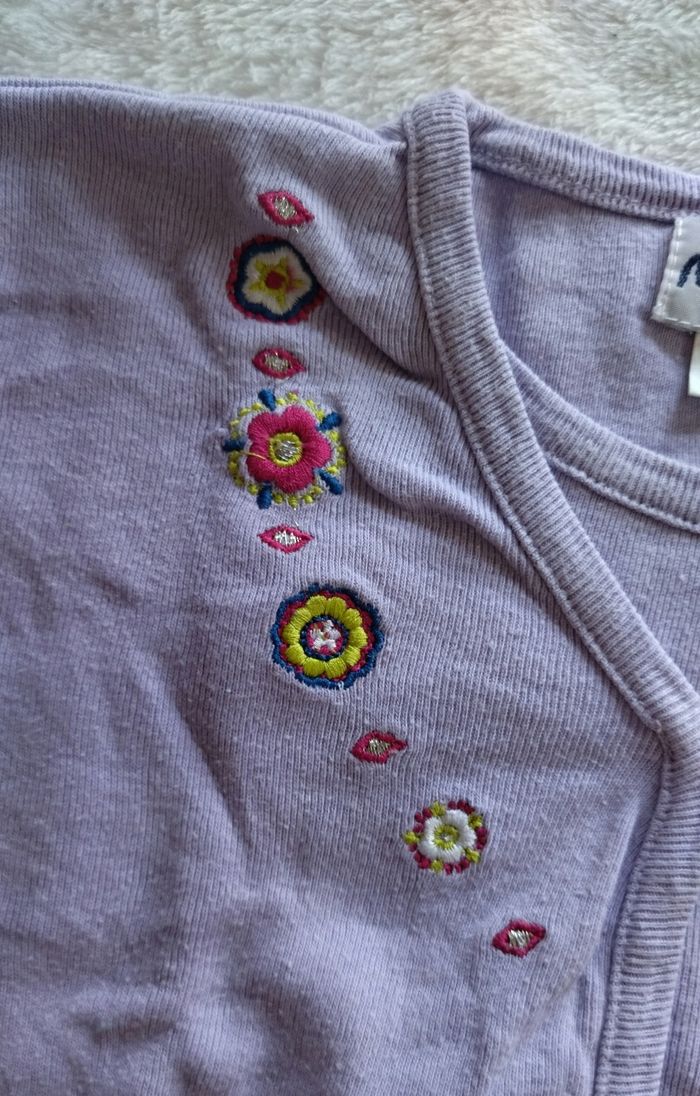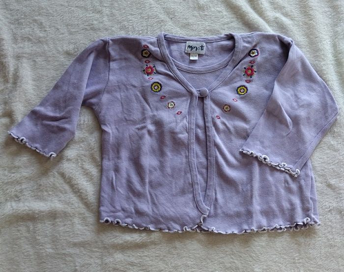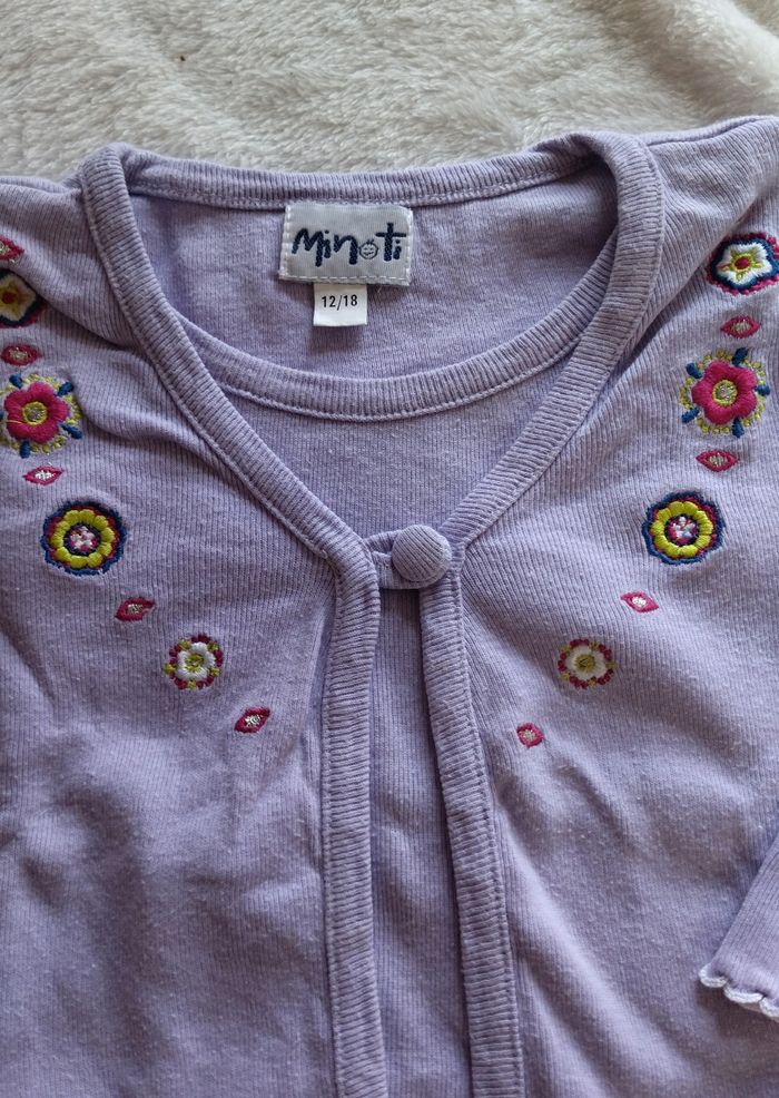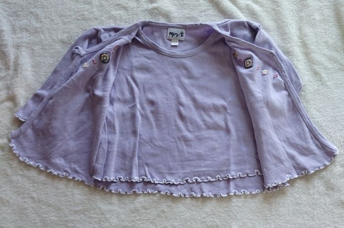 Sweat effet gilet par dessus parme de la marque MINOTI, Taille 12/18 mois Il y a des petits frisottis en bas des manches, il est plutôt large. (Me demandé si vous voulez la mesure).