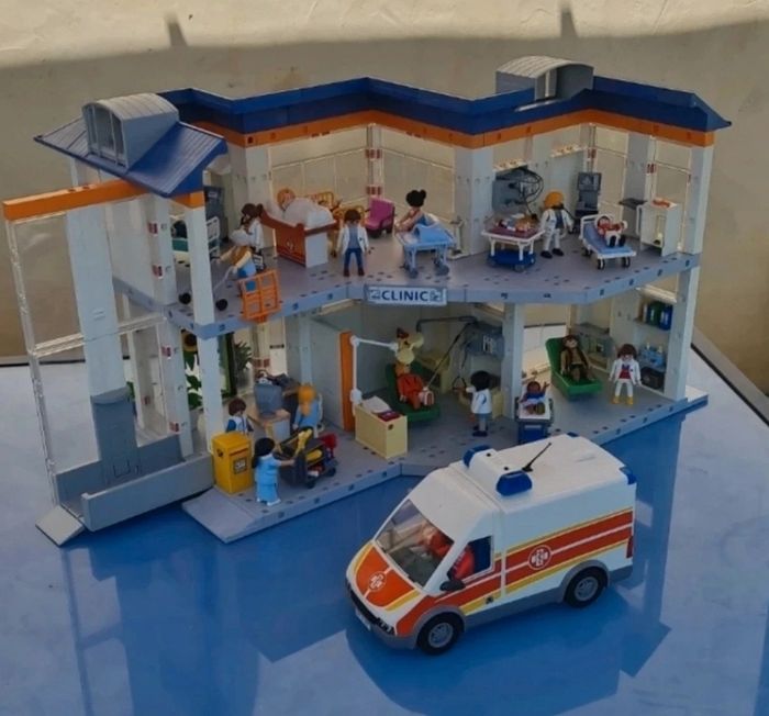 Super grand hôpital avec son ambulance et de très nombreux accessoires ainsi que 21 figurines ( personnels hospitalier, chirurgiens, malades, personne âgée et femme de ménage). Prenez conscience que de nombreux accessoires ont été rajoutés par rapport à la boîte d'origine. Vous achetez tout ce que vous voyez sur les photos. Sans notice. Seule la boîte de l'ambulance présente. Envoi soigné et rapide.