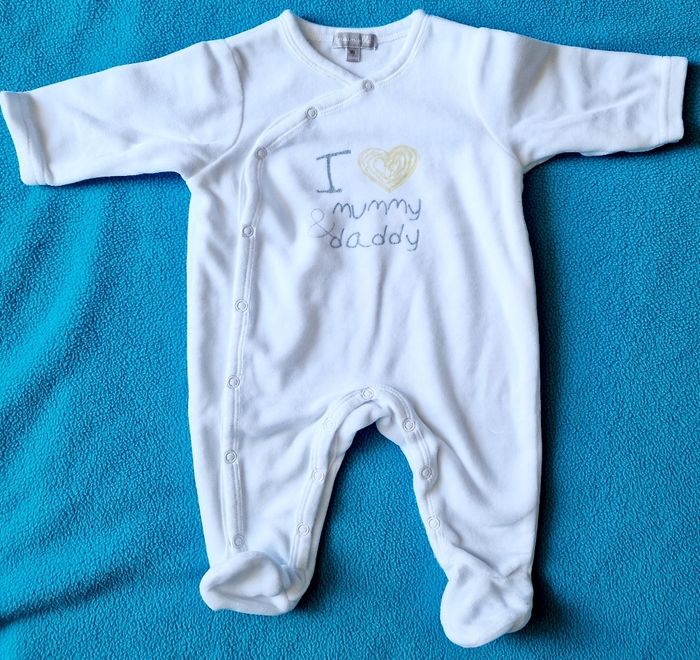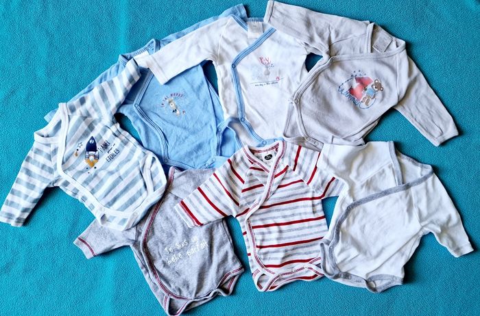 Lot de vêtements bébé 1 mois en excellent état. 7 tenues + 7 bodys (dont 2 neufs) Les vêtements ont été lavés à la lessive bébé et sont prêts à être portés.