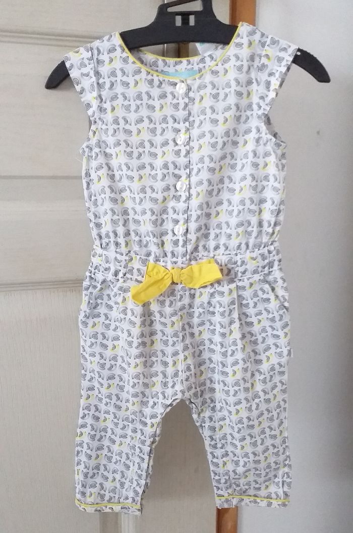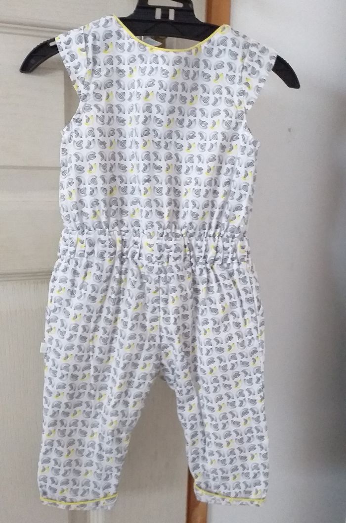 Porté plusieurs fois. Combinaison pantalon d'été. Fermeture par boutons devant et par boutons pressions au niveau du bas pour pouvoir changer bébé plus facilement.