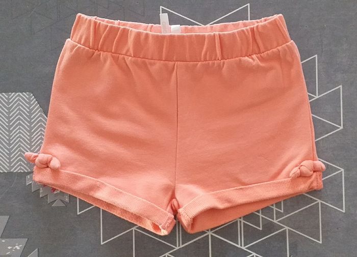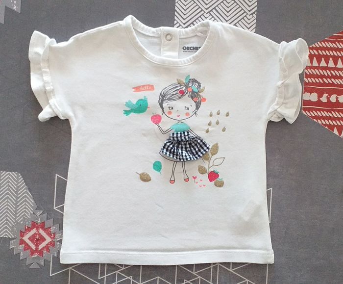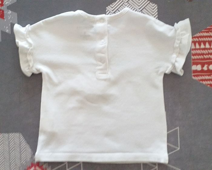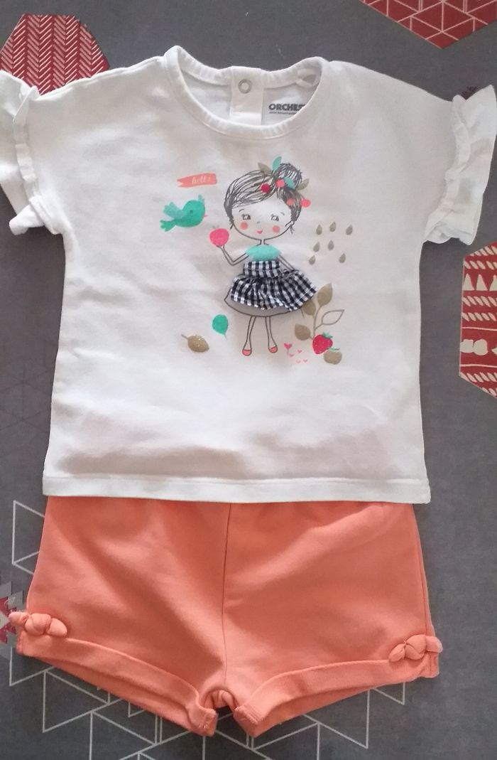 Porté quelques fois. Tee-shirt avec une petite fille dessus. Fermeture dans le dos par boutons pressions. Et le short avec taille élastique et petit nœud décoratif.