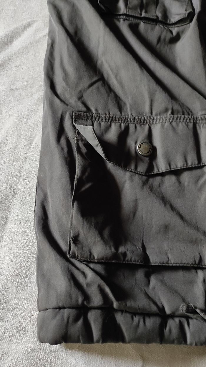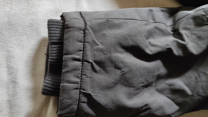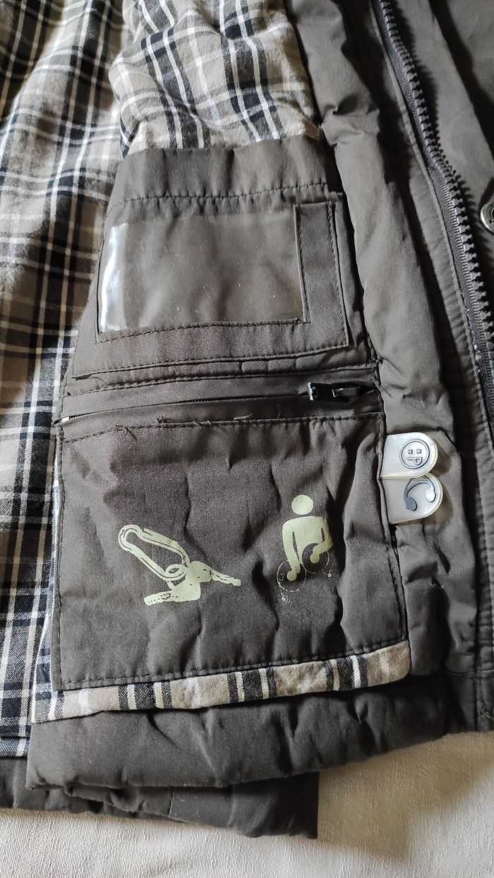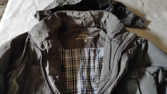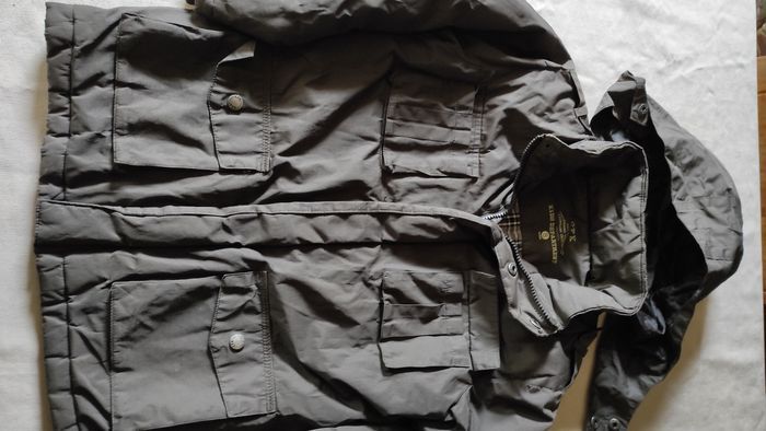 Manteau veste marron en bon état général. Deux accrocs peu visibles. Un à l'arrière de la manche droite et l'autre sur une des poches à l'avant. Voir dernières photos. Peut largement avoir une deuxième vie. Capuche rétractable dans le col. Fermeture éclair + boutons pression.Diverses poches intérieures. Marque CFK