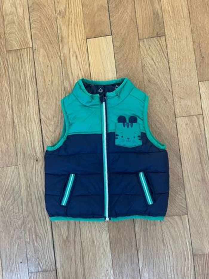 Doudoune verte et bleu et intérieur bleu motifs chat. 9M-71cm