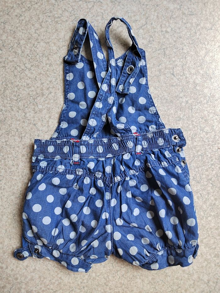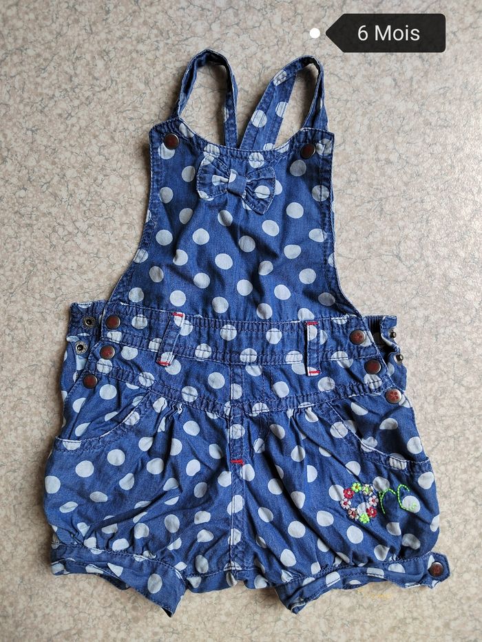 Salopette short bleu à poid blanc en parfait état, porté 1 fois. Taille 6 mois Marque : Orchestra Prix : 3 €
