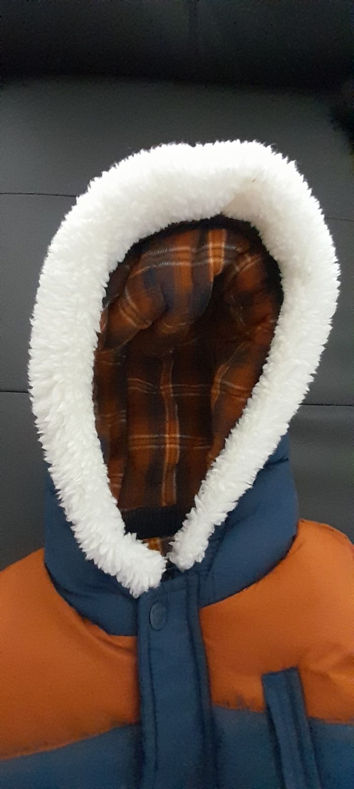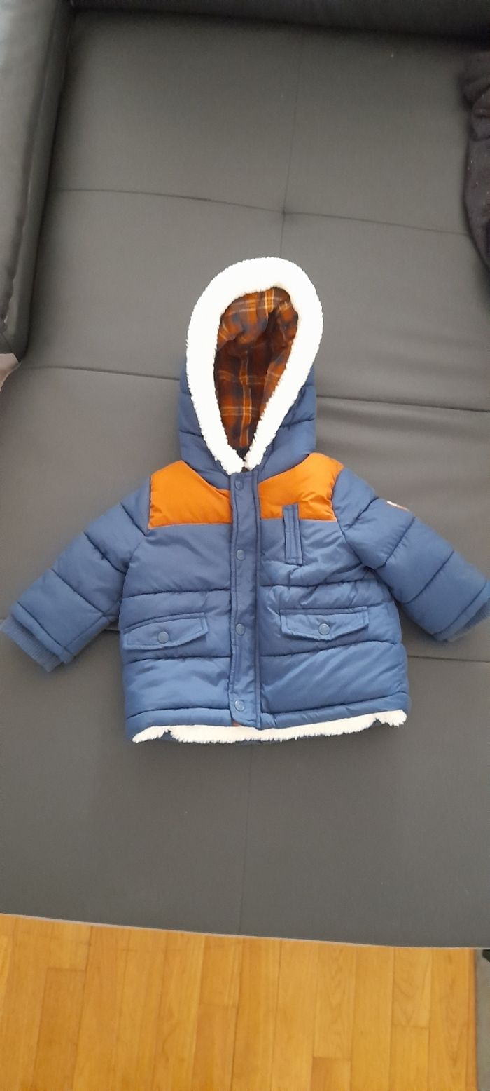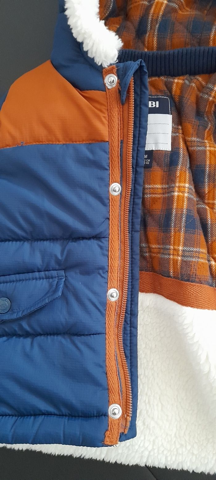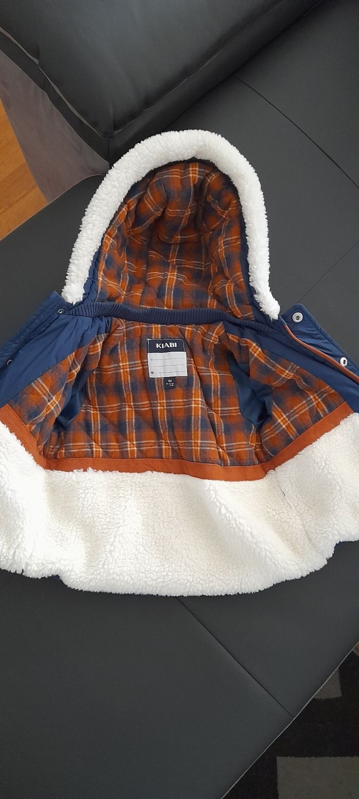 Blouson T 9 mois Marque KIABI Couleur bleu marine et marron Attaches central fermeture éclair et pressions Capuche doublure écossaise et fausses moumoute blanche 3 fausses poches devant Doublure intérieure écossaise et fausses moumoute blanche Logo manche gauche Neuf sans étiquette jamais porté (cadeau en double)
